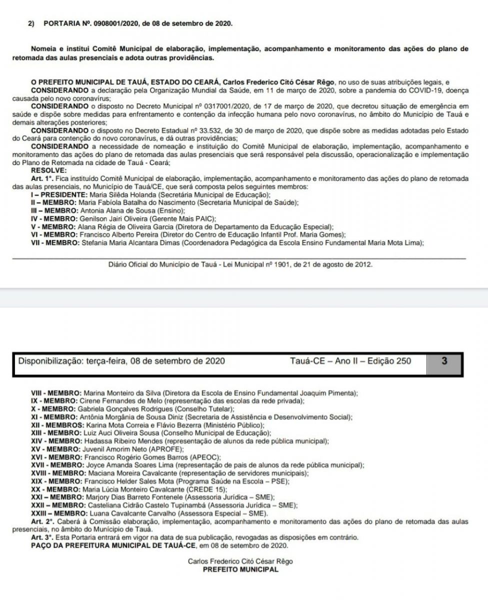 Portaria assinada pelo prefeito de Tauá, Fred Rêgo nesta terça-feira(08), institui o Comitê Municipal de elaboração, implementação, acompanhamento e monitoramento das ações do plano de retomada das aulas presenciais.