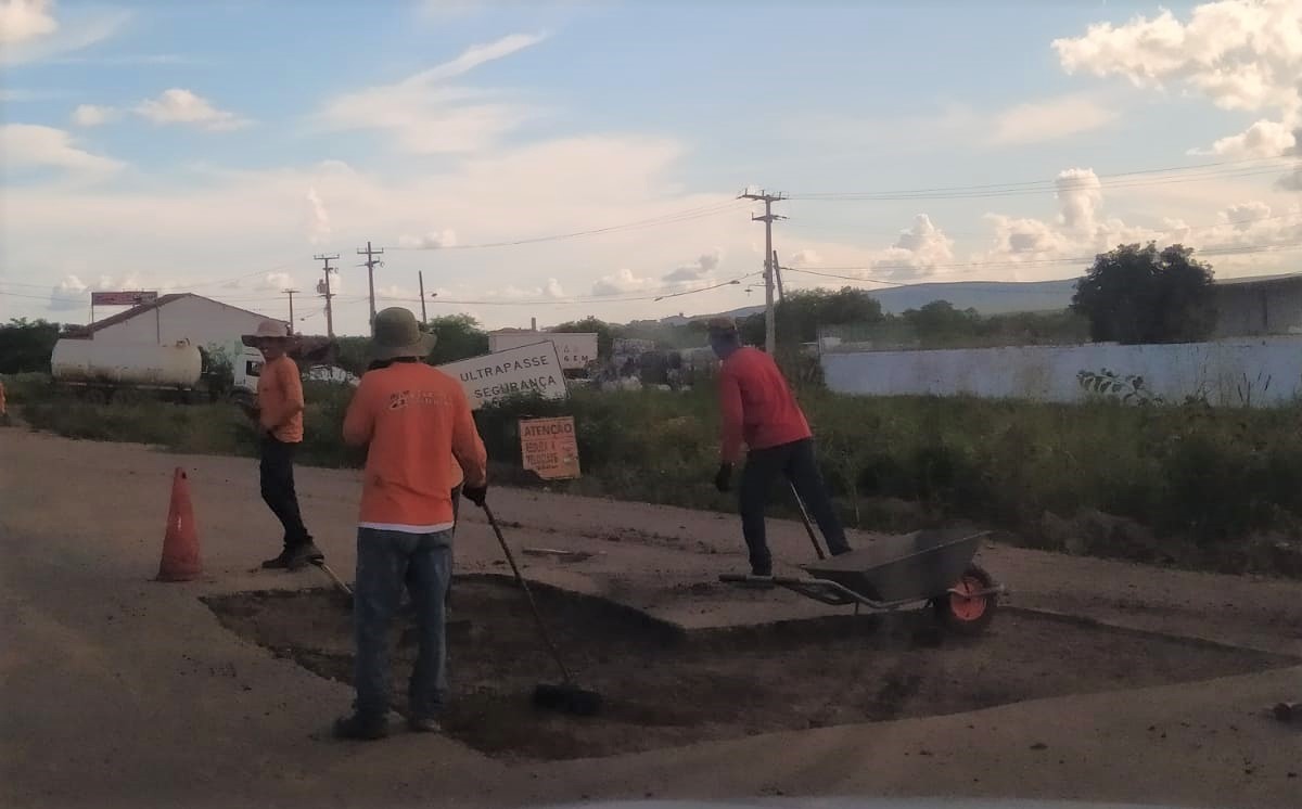 Em alguns trechos, homens usam ferramentas manuais em serviços paliativos que não resolvem o problema
