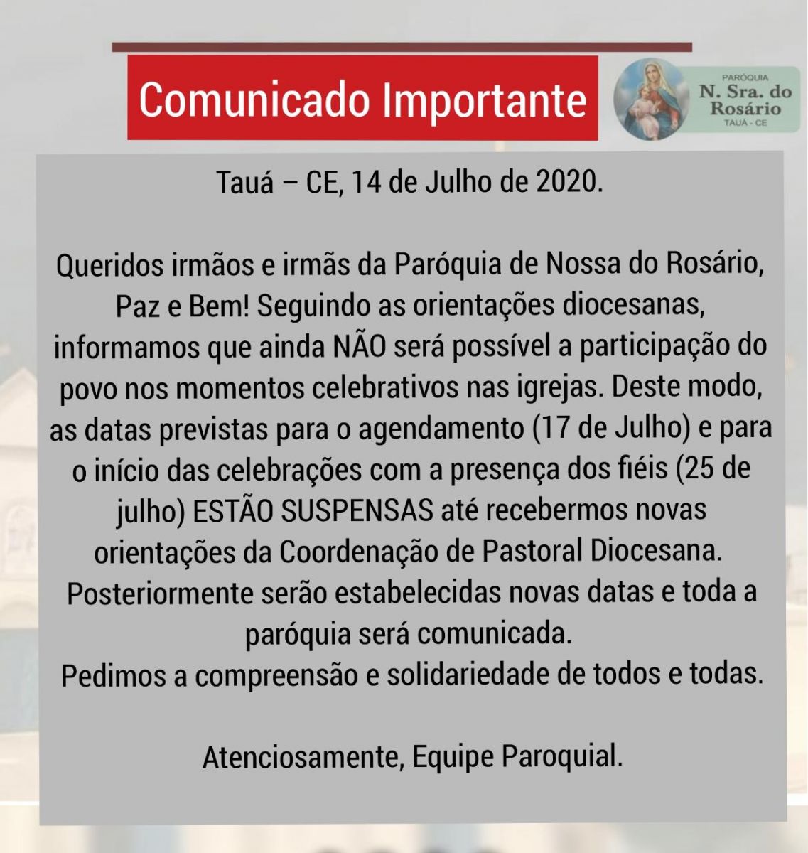 A Paróquia de Nossa Senhora do Rosário anuncia que as celebrações continuam suspensas no município de Tauá para evitar aglomerações e cumprir as normas estabelecidas pelos decretos, estadual e municipal, de isolamento social.
