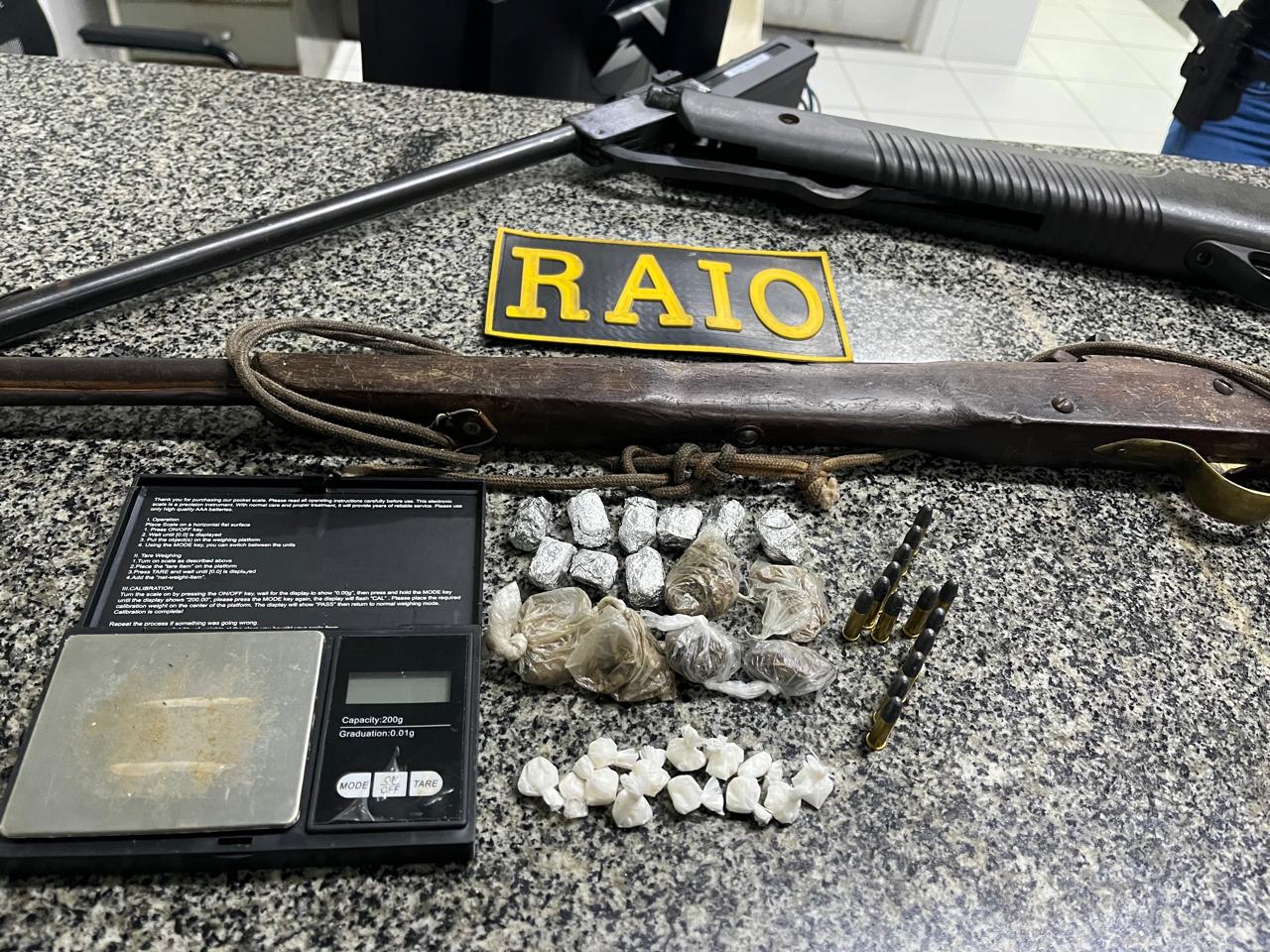 Chegar ao local, o suspeito avistando a equipe empreendeu fuga em direção a uma área de mata, diligências foram realizadas mas sem êxito. Ao fazer uma busca no bar, foram encontradas 2 espingardas e 14 munições calibre 22 atrás de um freezer de bebidas, 13 papelotes de cocaína,15 papelotes de maconha, e 1 balança de precisão embaixo de uma caixa de cerveja.