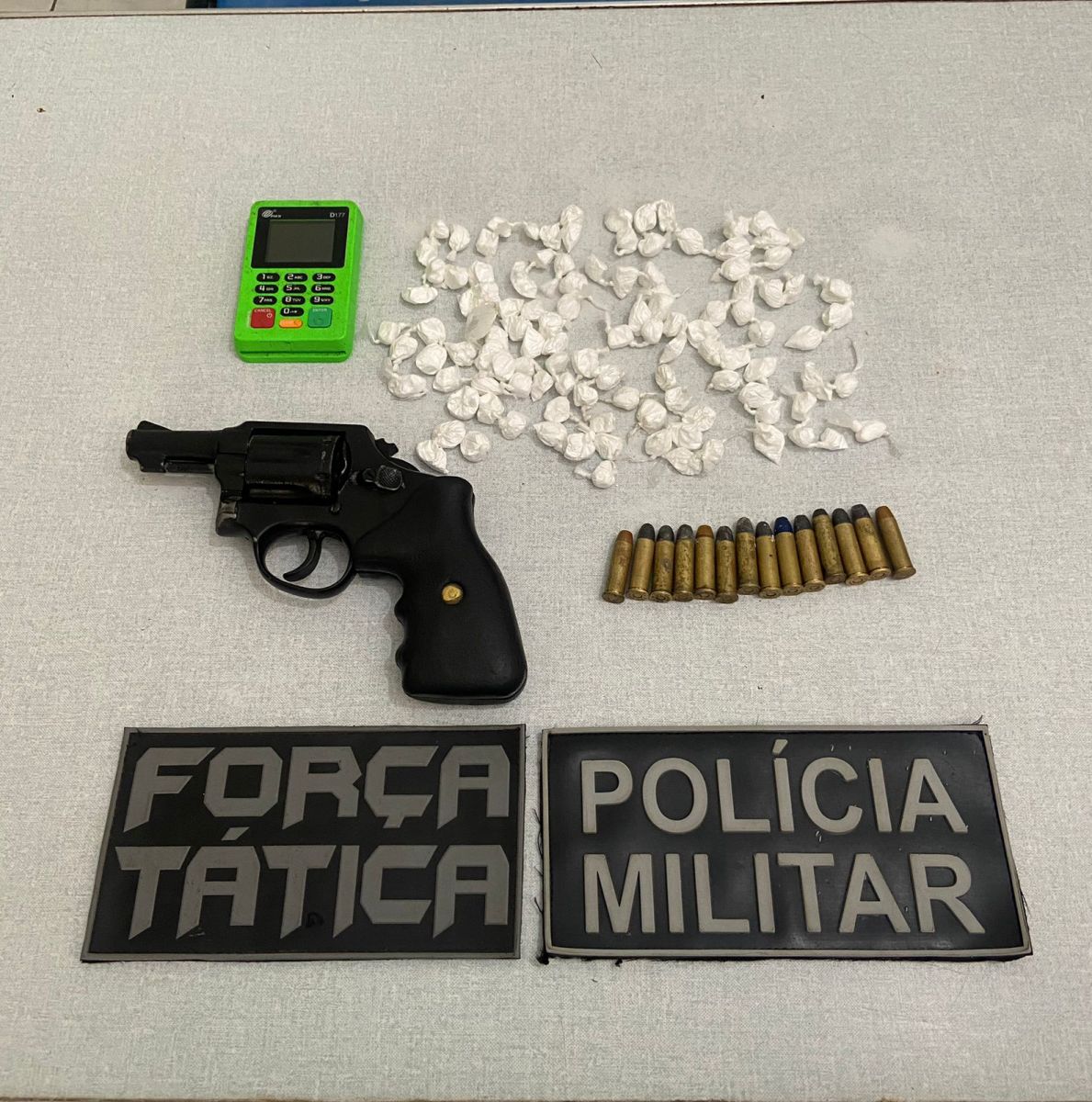 No imóvel, estavam mais 3 suspeitos, que ao verem a aproximação das composições, conseguiram escapar pelos fundos da casa, deixando na sala, um revólver Taurus cal.38. As equipes continuaram a abordagem e encontraram mais invólucros com drogas.