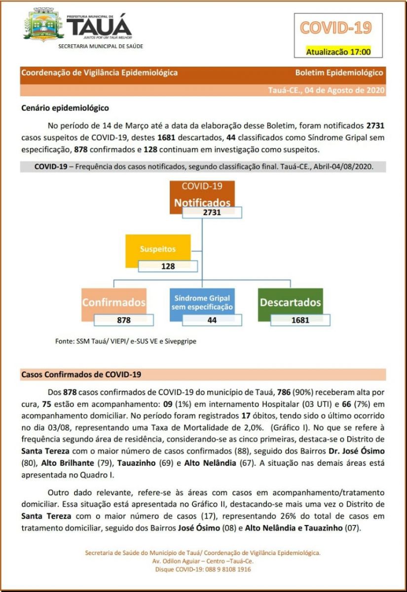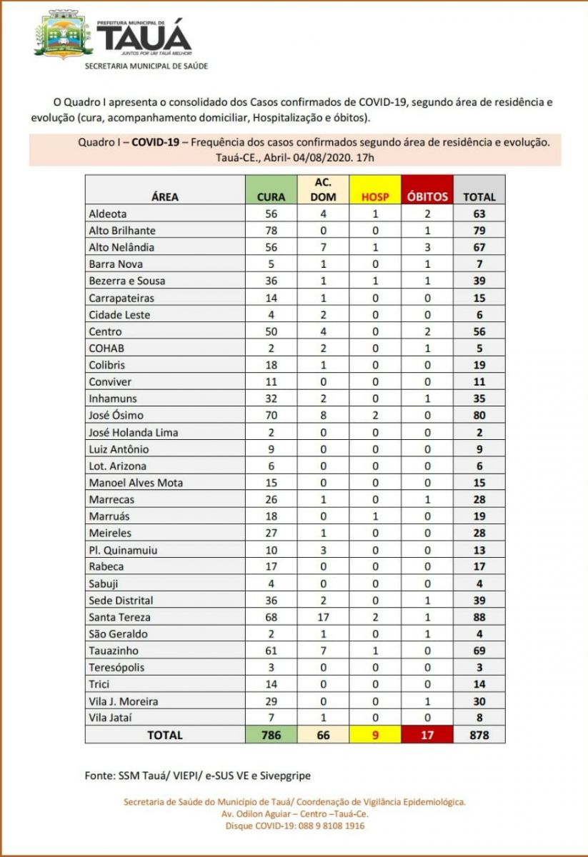 A Secretaria de Saúde atualizou na manhã de hoje(05), a situação do coronavírus no município de Tauá, que já se aproxima dos 900 casos da doença.