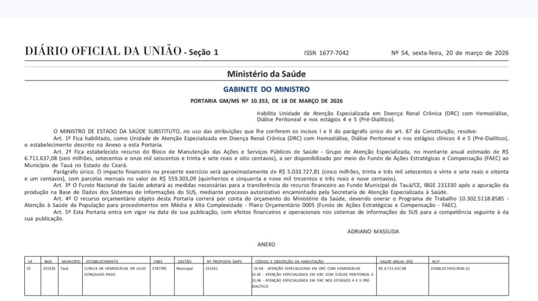 O Ministério da Sáude publicou no Diário Oficial da União desta sexta-feira (20/03), uma Portaria habilitando o Centro de Hemodiálise Dr. Júlio Gonçalves Rêgo, inaugurado na última quarta-feira (18/03), em Tauá, como Unidade de Atenção Especializada em Doença Renal Crônica (DRC).