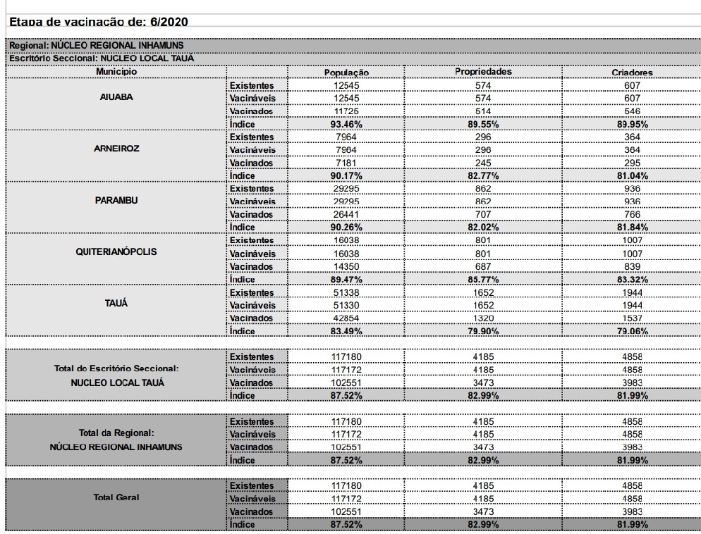 De acordo com o documento enviado ao Blog do Wilrismar, 3 municípios já superaram 90% dos animais vacinados, são eles, Aiuaba(93,46%); Arneiroz(90,17%) e Parambu(90,26%). Ele explica que a classificação leva em conta também, o número de propriedades e criadores que aderiram a campanha.