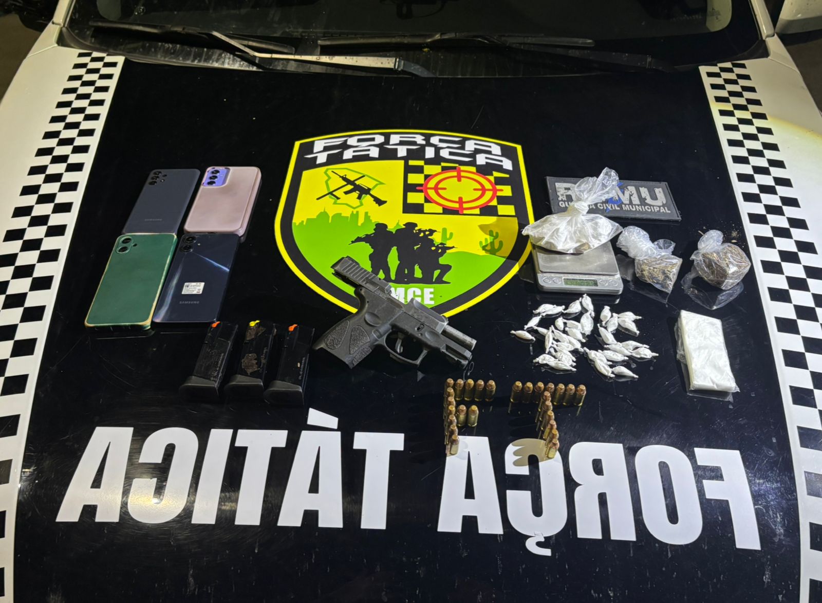 Equipes da Força Tática do 13º BPM e ROMU da Guarda Civil Municipal de Tauá apreenderam duas armas, drogas e outros materiais ilícitos durante patrulhamentos nos Bairros, Alto Nelândia e Colibris, na noite deste sábado (28/03).