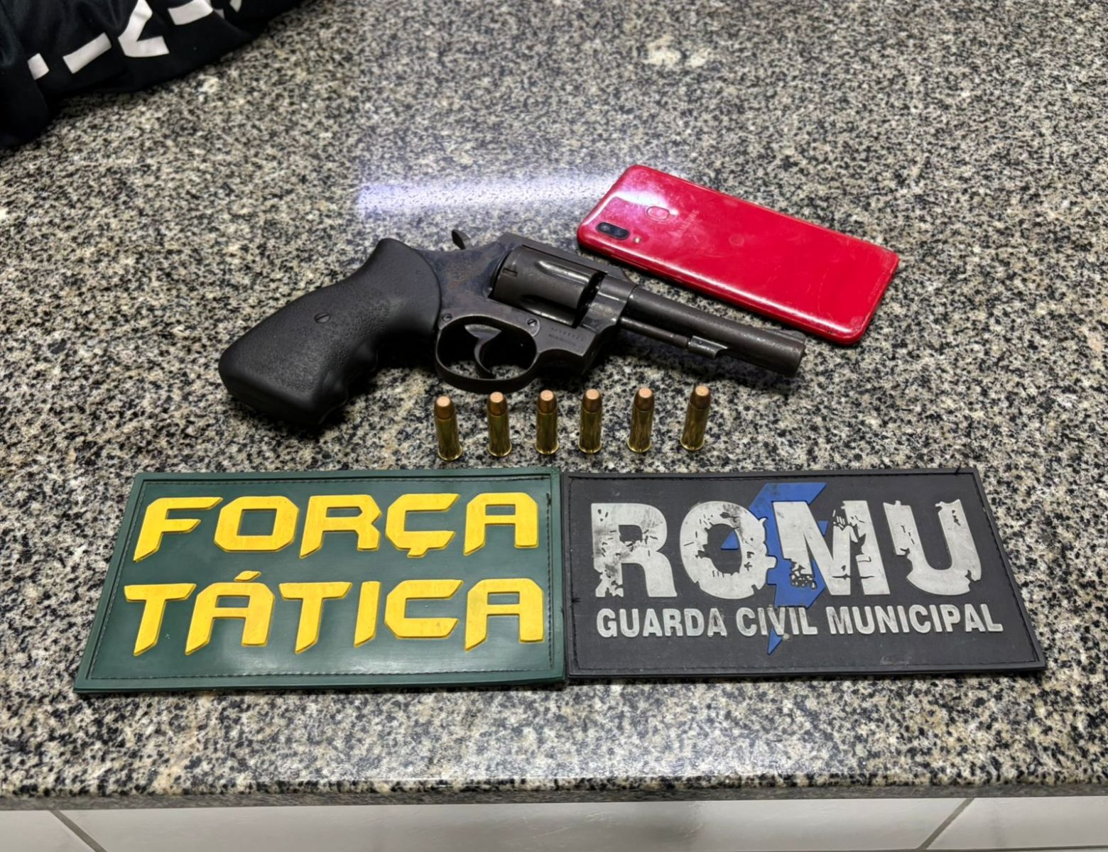 Já às 23h15, as equipes receberam denúncias sobre um indivíduo andando armado nas ruas do Bairro Colibris, e iniciaram as diligências. Passando pela Rua E, um homem identificado como Maurício Henrique da Silva, 25 anos, foi abordado, sendo encontrado revólver Taurus calibre 38, com 6 munições intactas.
