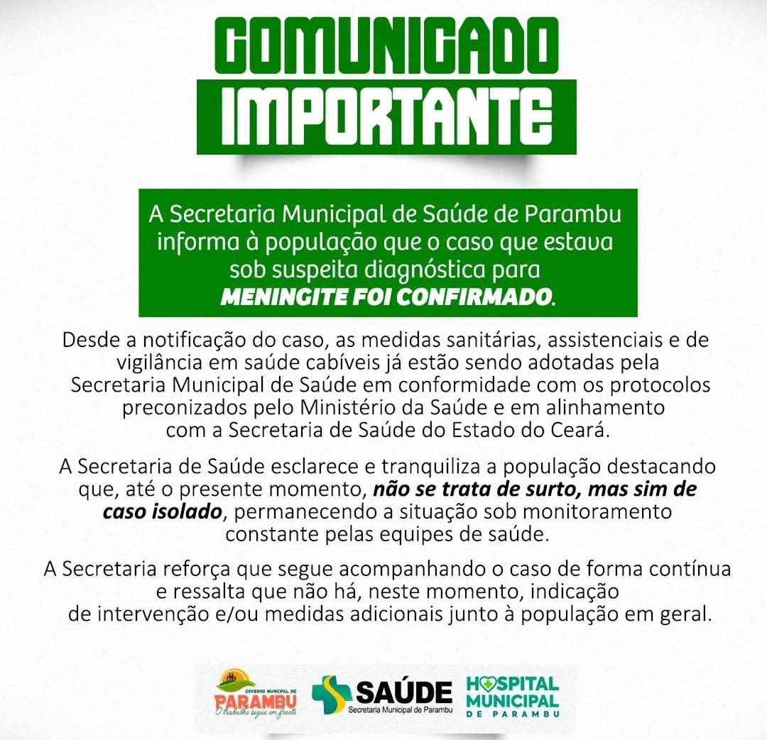 A Prefeitura de Parambu anunciou no final da tarde de hoje (18/04), a confirmação de um caso de meningite na zona rural do município.