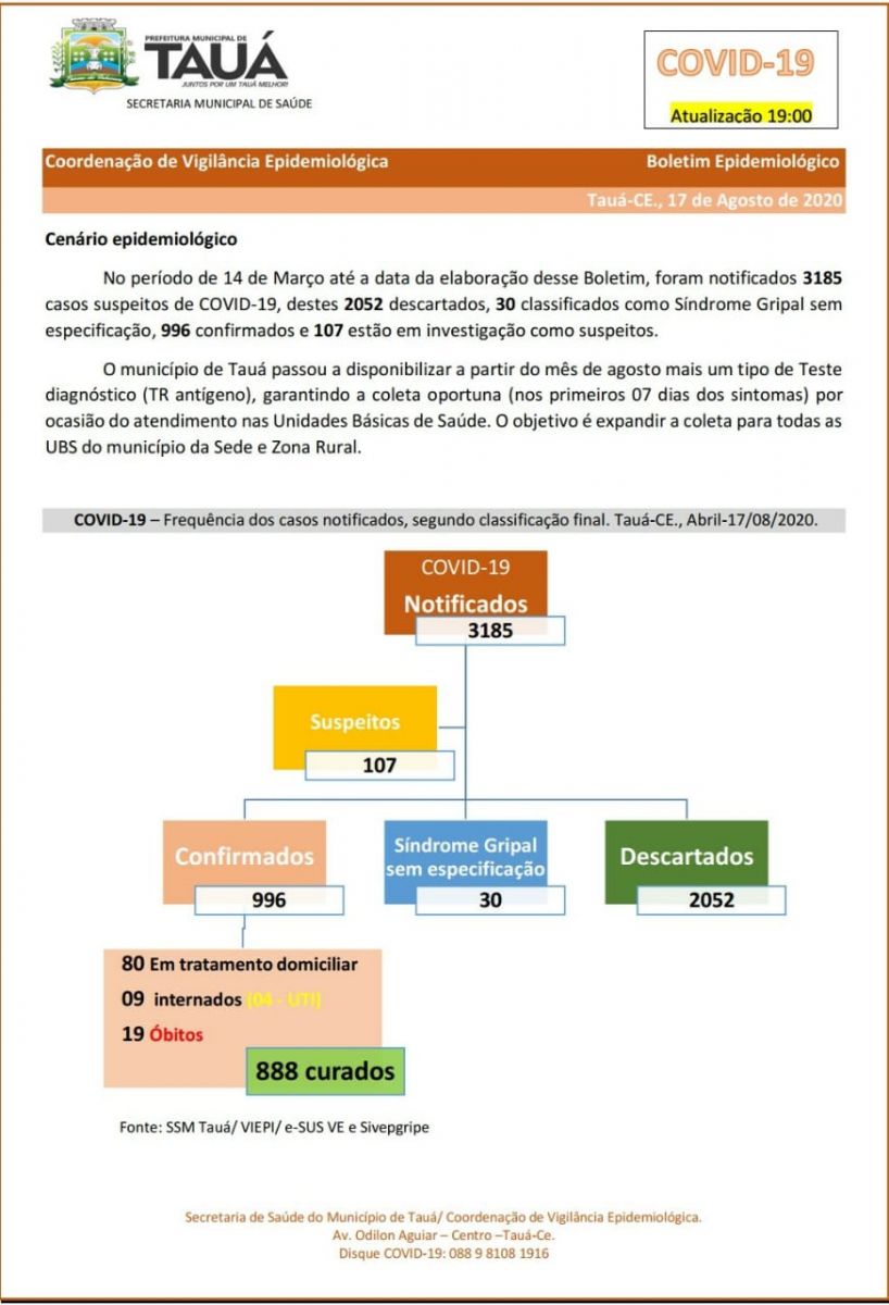 A Secretaria de Saúde de Tauá atualizou na manhã de hoje(18), os números da pandemia do coronavírus no município.