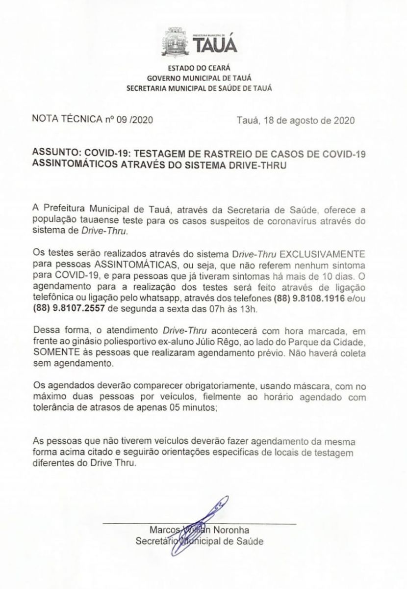 O Secretário de Saúde do município de Tauá, Dr. Marcos Willian informou ao Blog do Wilrismar que será iniciada a testagem rápida de pessoas assintomáticas contra o coronavírus no município de Tauá.