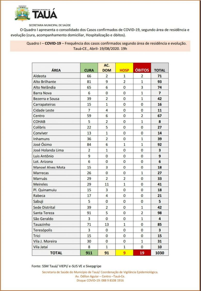 Tauá tem 1.030 casos confirmados e 99 suspeitos, com 19 óbitos.