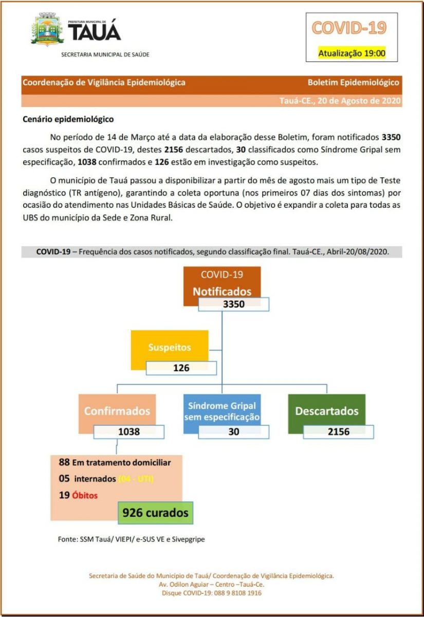 O boletim epidemiológico divulgado na manhã de hoje(21), pela Secretaria de Saúde mostra uma estabilidade nos índices de infecção e cura pelo coronavírus no município de Tauá.