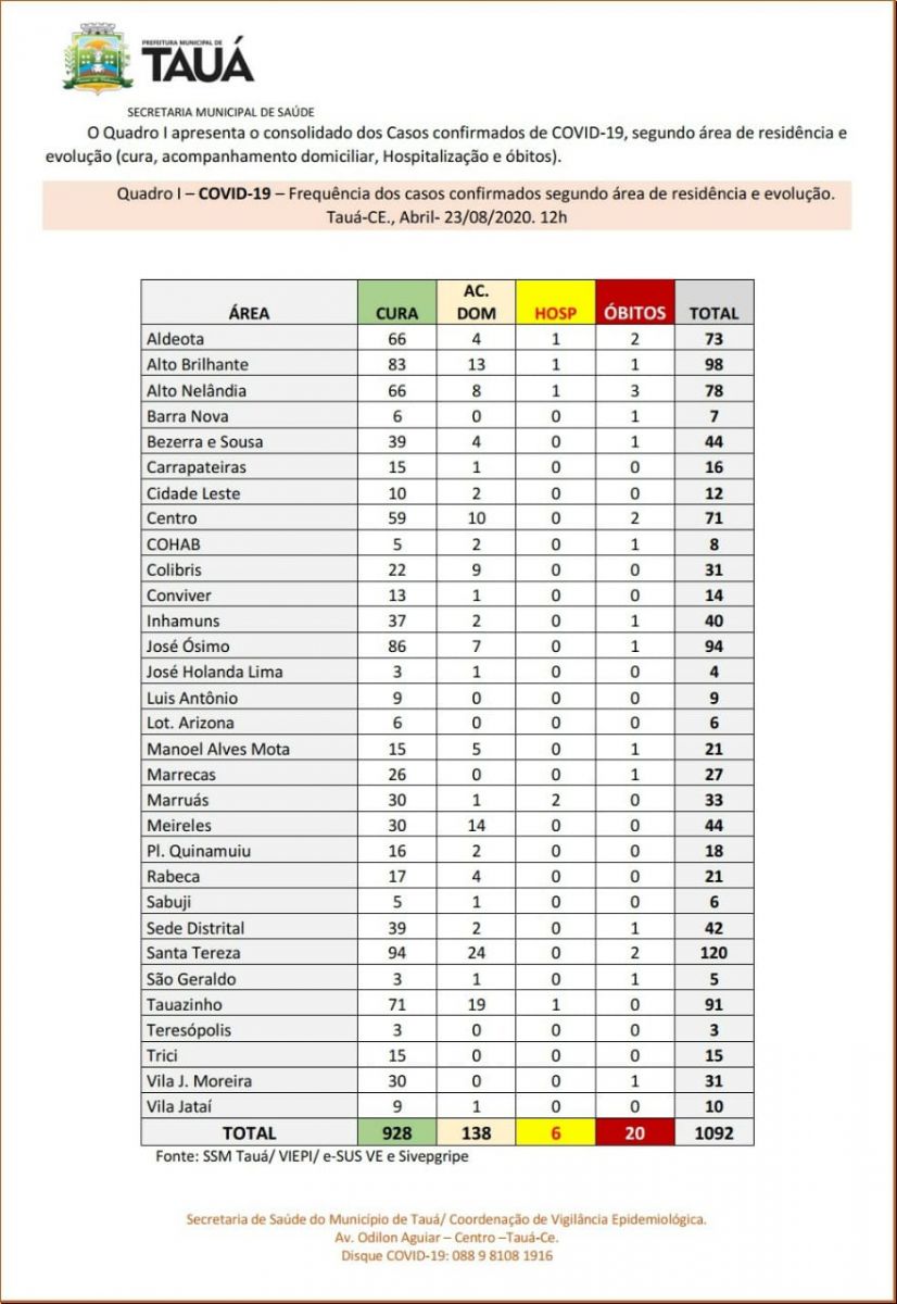 A Secretaria de Saúde do municipio de Tauá confirmou o 20º óbito por coronavírus. A vítima é um idoso de 86 anos, que residia no Bairro Manoel Alves Mota e havia falecido no último dia 15, mas a confirmação da causa da morte só ocorreu após a divulgação do resultado do exame. A informação consta no boletim epidemiológico atualizado ao meio dia de ontem(23) e divulgado na manhã desta segunda-feira(24).