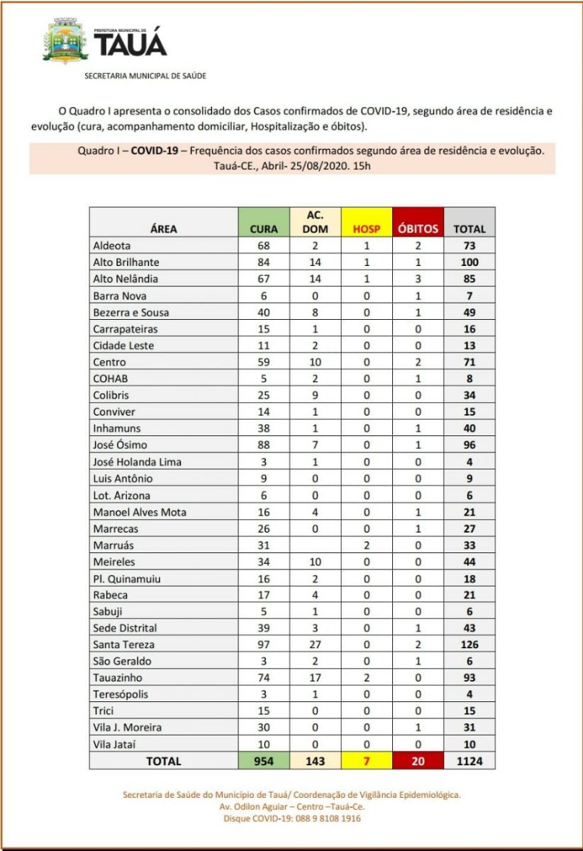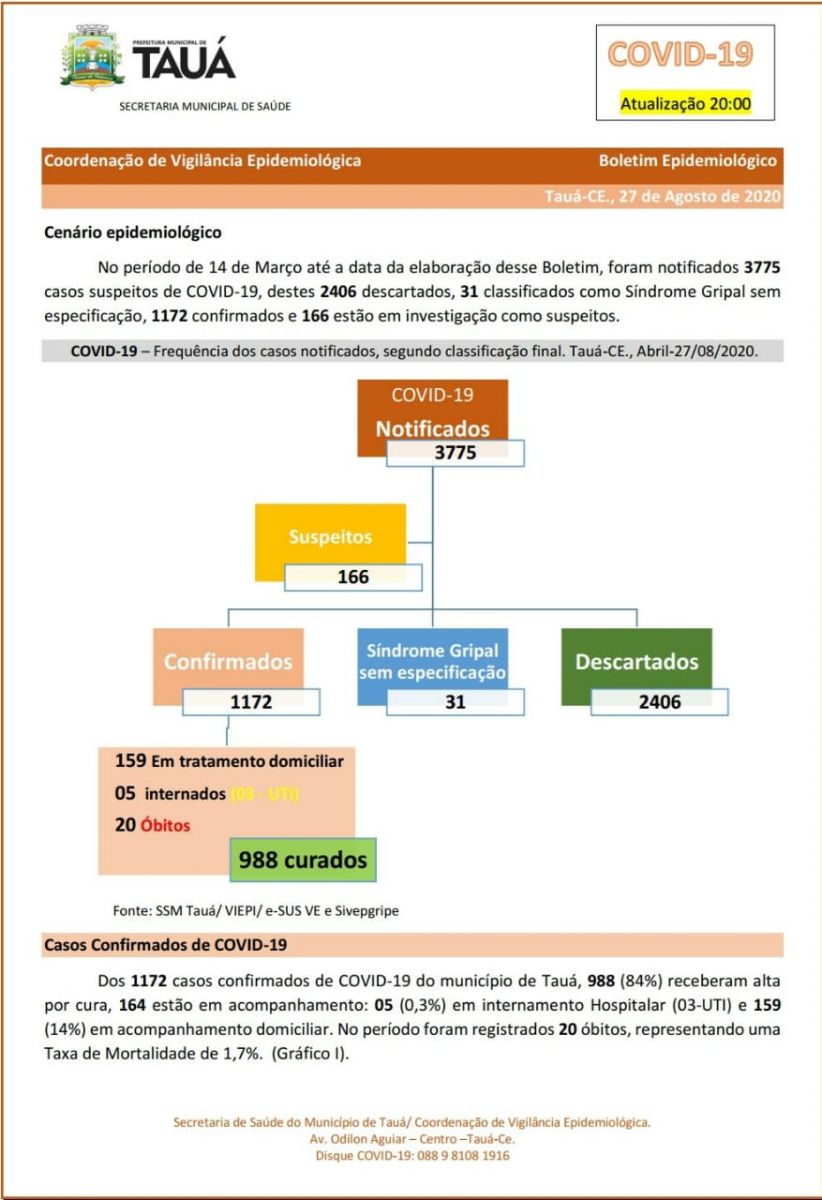 Os casos confirmados são 1172 confirmados, com 988 pessoas curadas. 20 pessoas já morreram em Tauá
