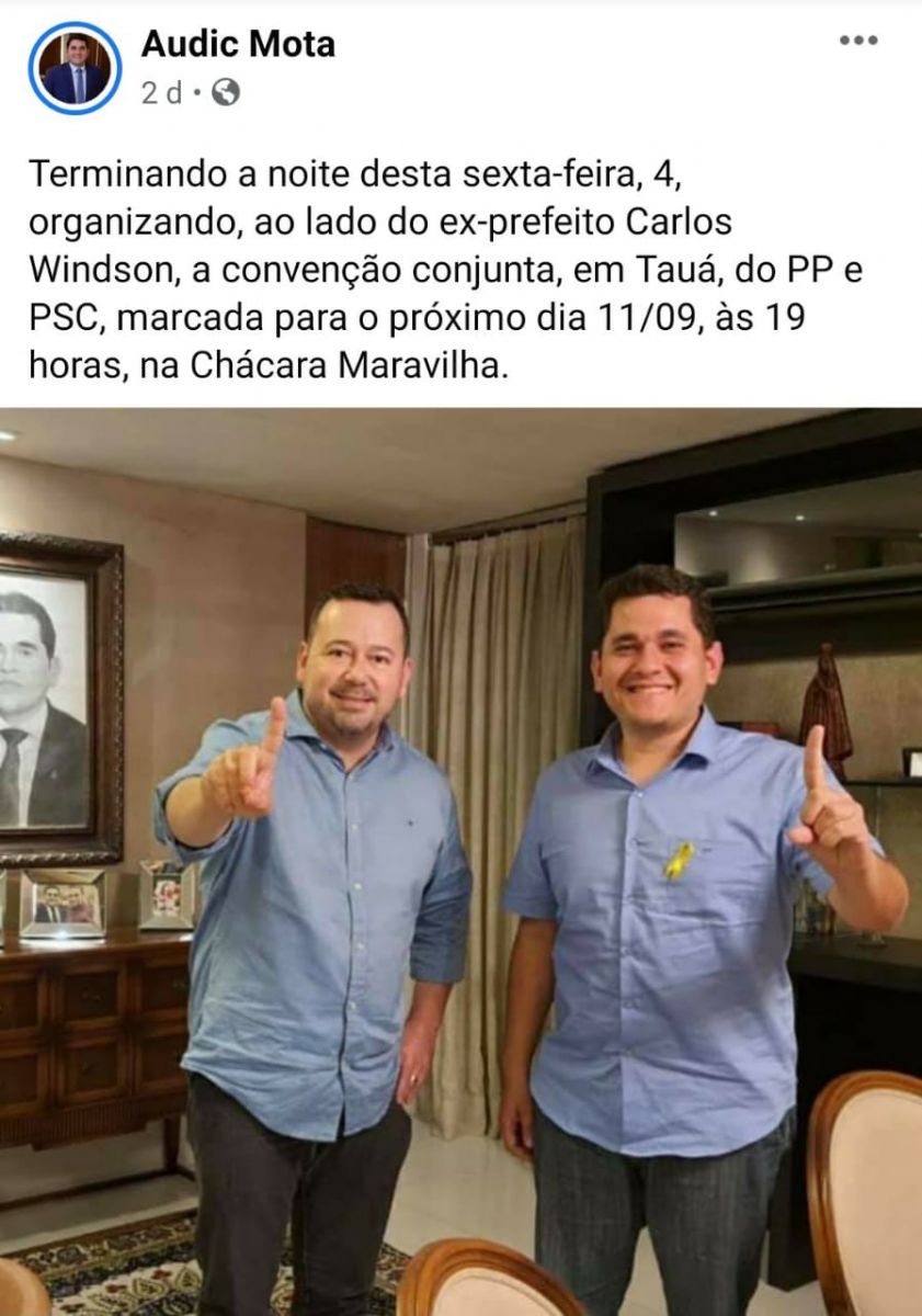 O Dep. Audic Mota e o ex-prefeito Carlos Windson selaram a aliança política para as eleições municipais em Tauá. O anúncio foi feito pelo próprio parlamentar em suas redes sociais, após encontro realizado neste final de semana.