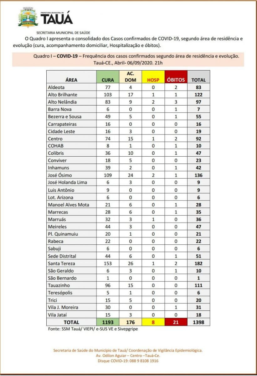 Boletim epidemiológico divulgado na manhã de hoje(09), pela Secretaria de Saúde confirma o 22º óbito por coronavírus no município de Tauá. A morte ocorreu no último dia 30 de agosto e a confirmação só ocorreu agora. A vítima residia no Bairro Alto Brilhante.
