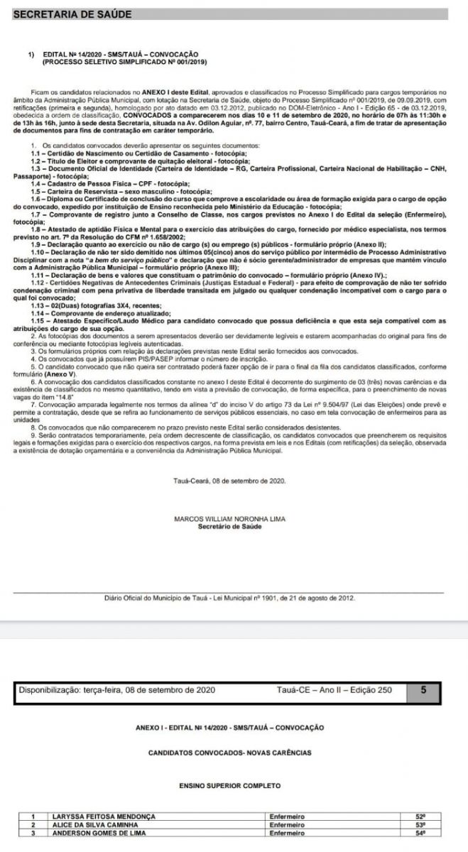 A Secretaria de Saúde do Município de Tauá convocou mais 3 candidatos aprovados no processo seletivo realizado em 2019 para entrega de documentação e processo de contratação.