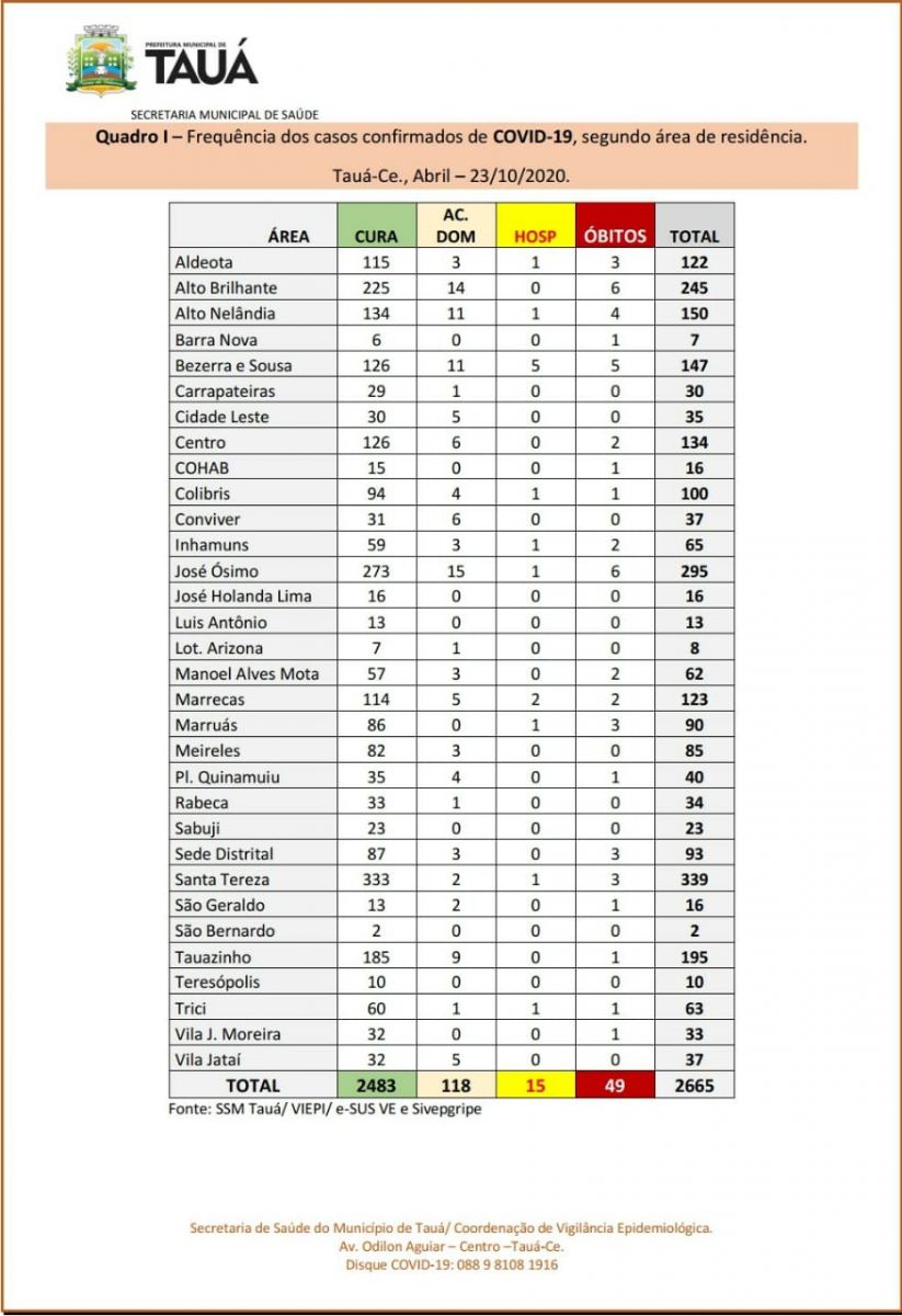 A Secretaria de Saúde divulgou na noite deste sábado(24), mais um boletim epidemiológico atualizando os números da pandemia da Covid-19 no município de Tauá, que registrou mais dois óbitos, passando para 49, o número de mortes pela doença.