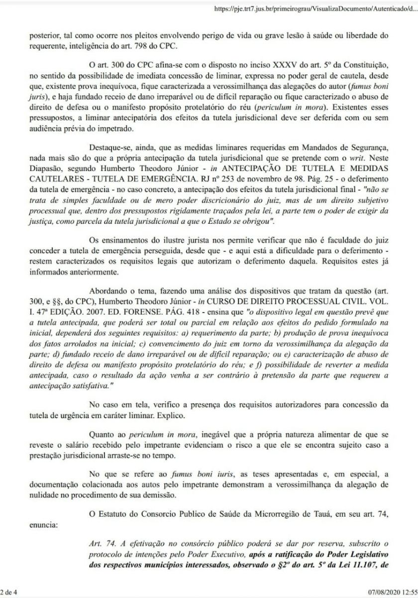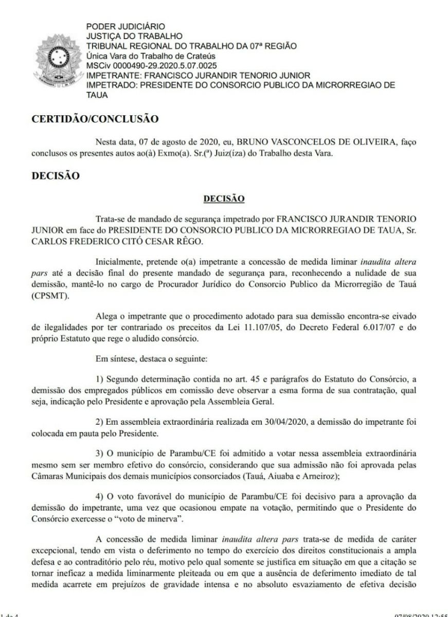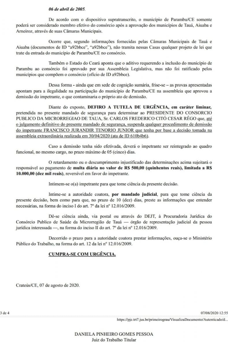 No dia 07 de agosto, a Juíza do Trabalho de Crateús, Dra. Daniela Pinheiro Gomes Pessoa determinou por meio de medida liminar, que o Presidente do Consórcio de Saúde da Microrregião de Tauá, Fred Rêgo, suspenda qualquer procedimento de demissão do advogado Francisco Jurandir Tenório Júnior, do cargo de Procurador Jurídico do Consórcio e ainda fixou um prazo de 5 dias para cumprimento sob pena de multa diária de R$ 500,00, caso contrário, seria cobrada uma multa diária de R$ 500,00.