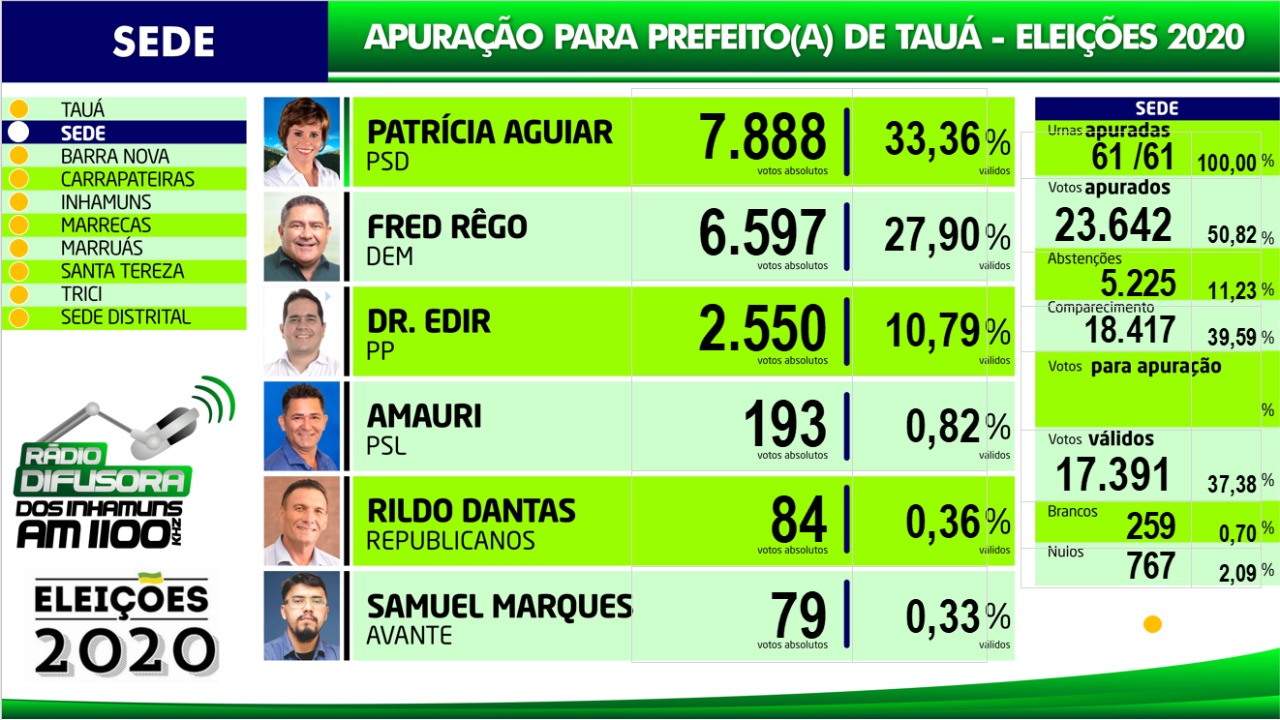 Confira os resultados da apuração das eleições para Prefeito de Tauá por distrito na apuração paralela realizada pela Rádio Difusora dos Inhamuns, ressaltando que podem ocorrer pequenas alterações em relação ao resultado oficial do TRE, mas que não influem no resultado geral.