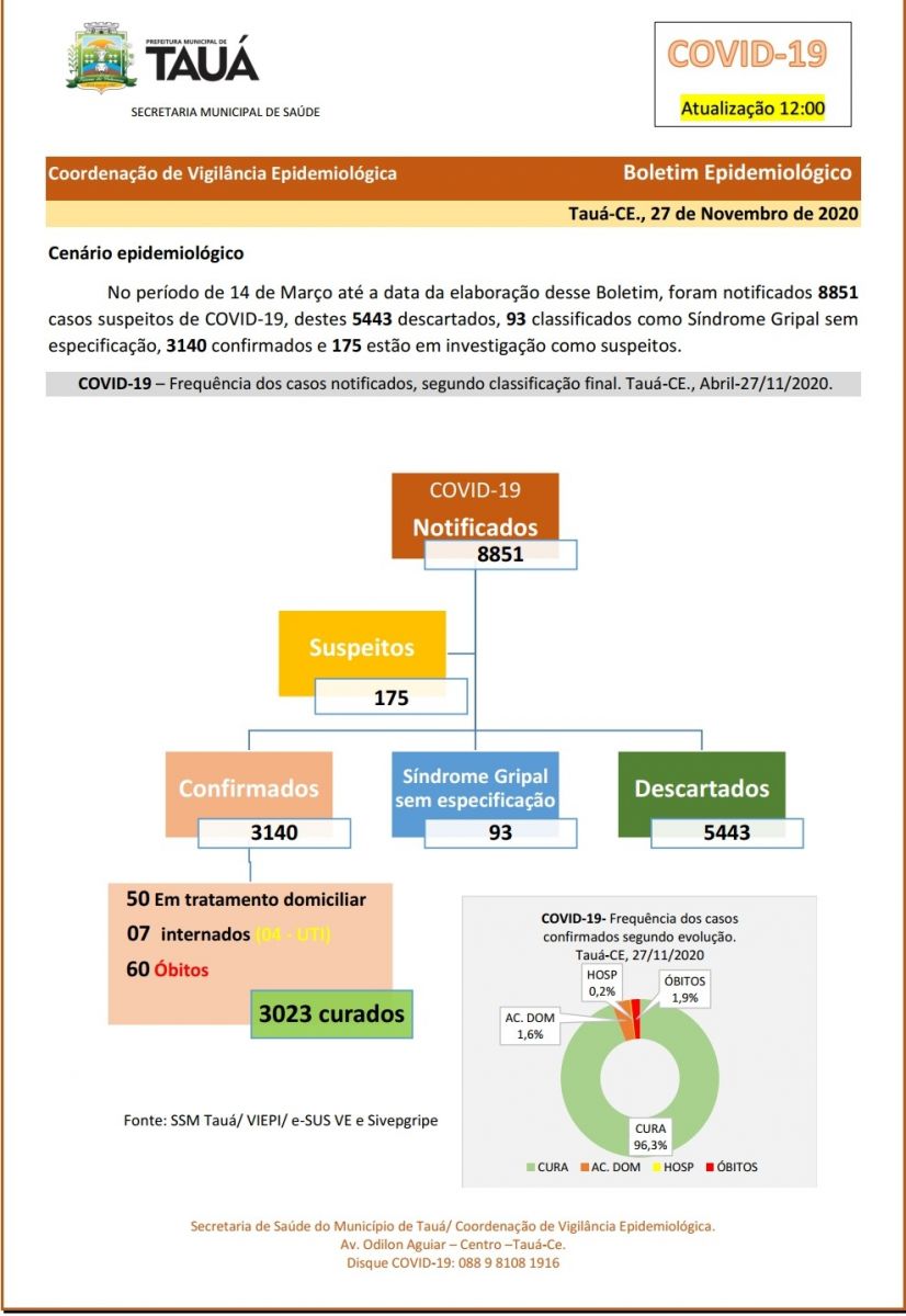 Na manhã de hoje(30), a Secretaria de Saúde atualizou o boletim epidemiológico da Covid-19 no município de Tauá.