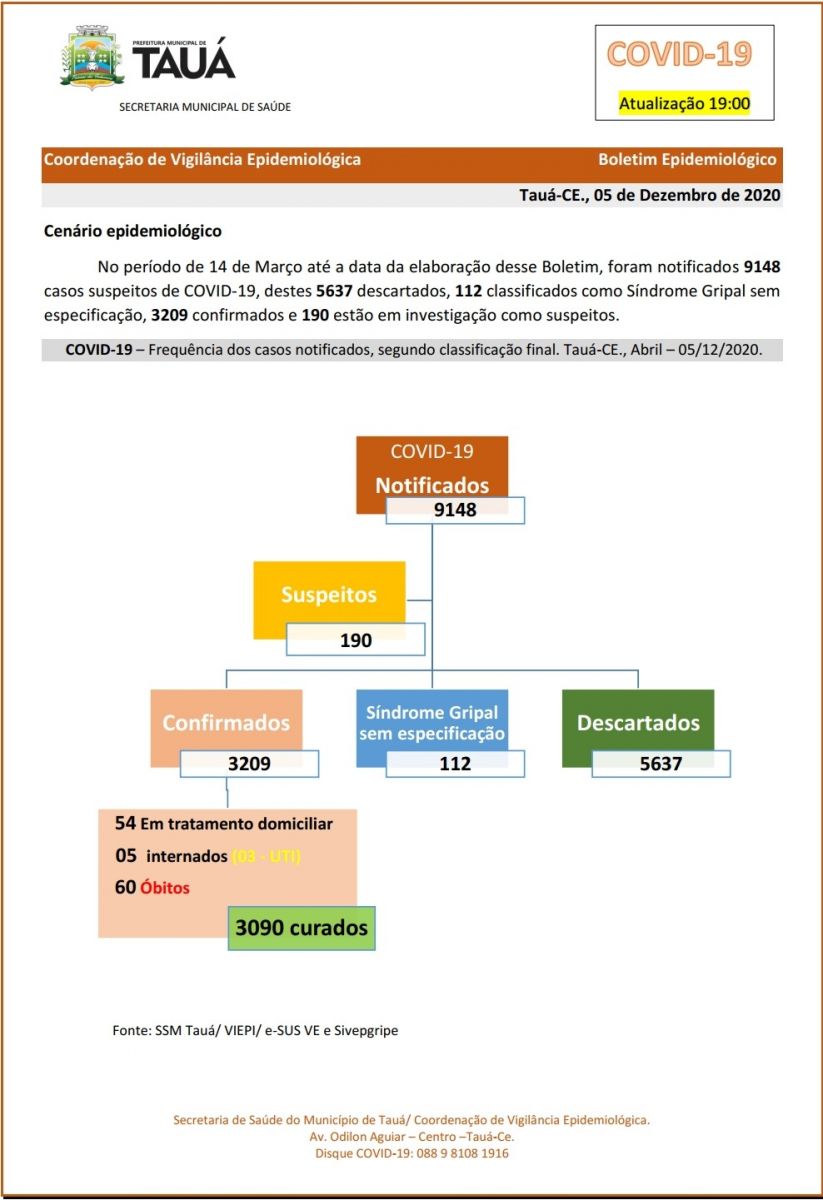A Secretaria de Saúde atualizou o boletim epidemiológico sobre a situação da Covid-19 no município de Tauá. Os números são das 19h do último sábado(05) e não registram óbitos nessa primeira semana de dezembro.