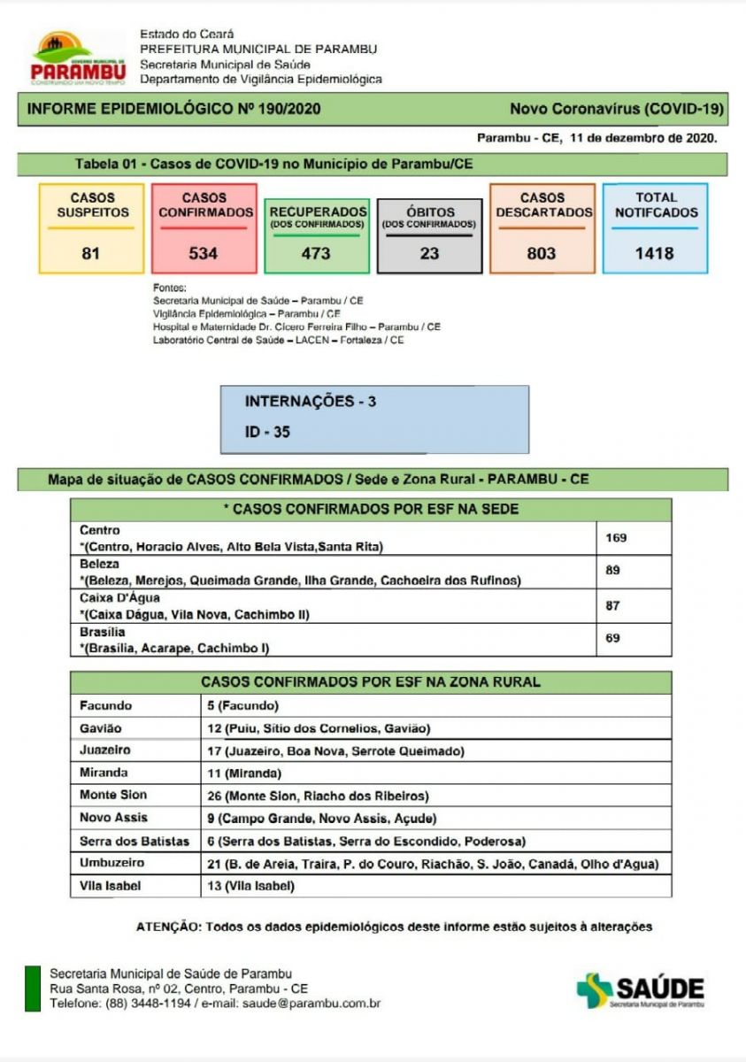 O município de Parambu voltou a registrar óbitos por Covid-19, segundo o boletim epidemiológico divulgado na tarde de hoje(11).