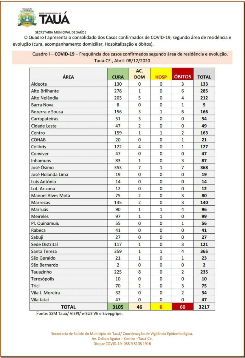 O 63º óbito por corovírus foi confirmado pela Secretaria de Saúde do Município de Tauá, em boletim atualizado às 20h de ontem(13). A morte da paciente ocorreu no Hospital Regional do Sertão Central, em Quixeramobim.