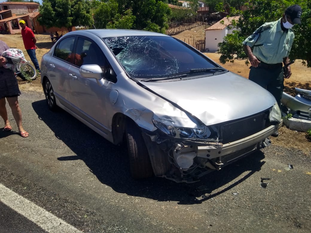 A colisão envolveu um Honda Civic, cor prata, placas NRE 1032-Fortaleza e uma motocicleta Honda, cor preta, placa OCK 3556-Boa Viagem, guiada por Antônio Bomfim, residente no Assentamento Monte Moriá, distrito de Barra Nova.