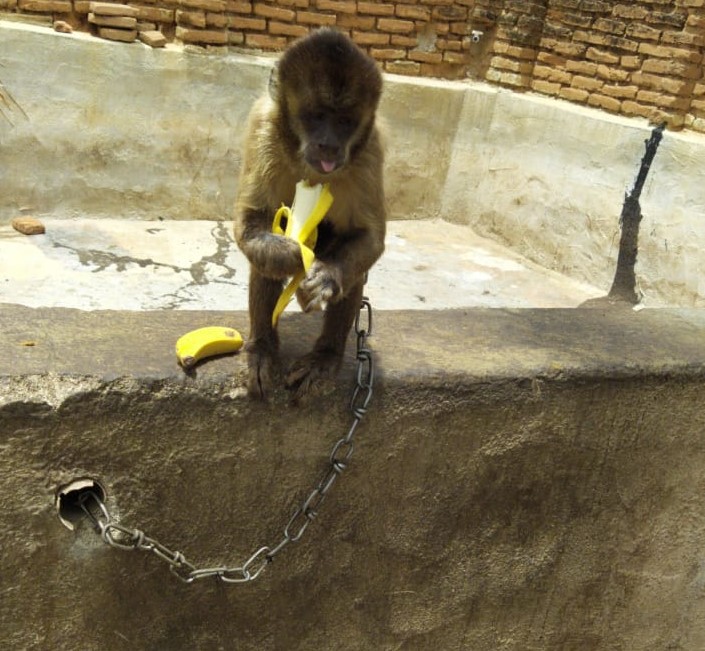 Na residência, os inspetores encontraram um macaco prego preso a uma corrente e dois papagaios em uma pequena gaiola.