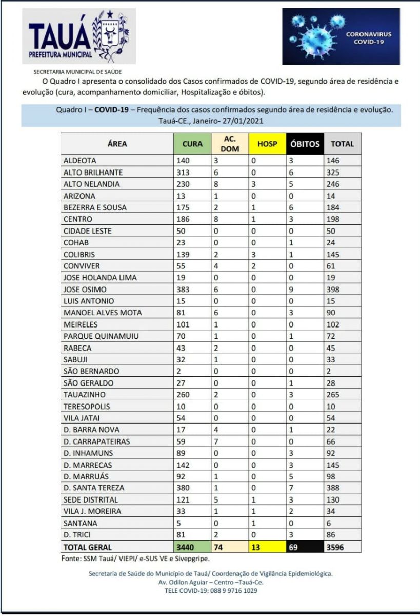 O Boletim Epidemiológico divulgado na noite de hoje(27), pela Secretaria de Saúde apresenta leve redução no número de pacientes infectados pela Covid-19, no município de Tauá.