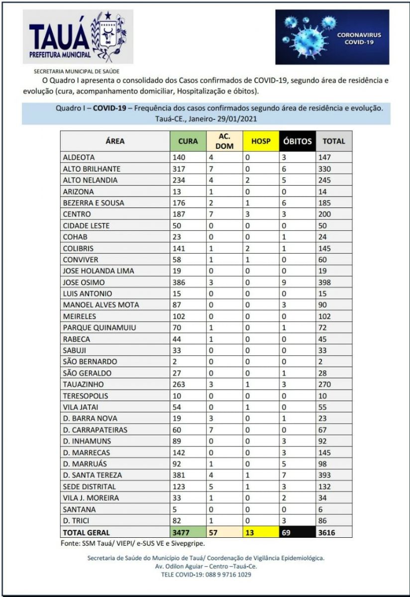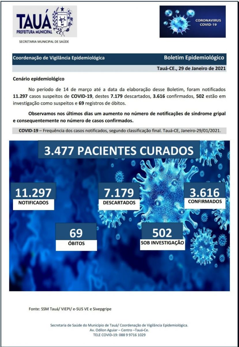O município de Tauá contabiliza 70 pacientes infectados pelo coronavírus, segundo o Boletim Epidemiológico divulgado na noite de ontem(29), pela Secretaria de Saúde.