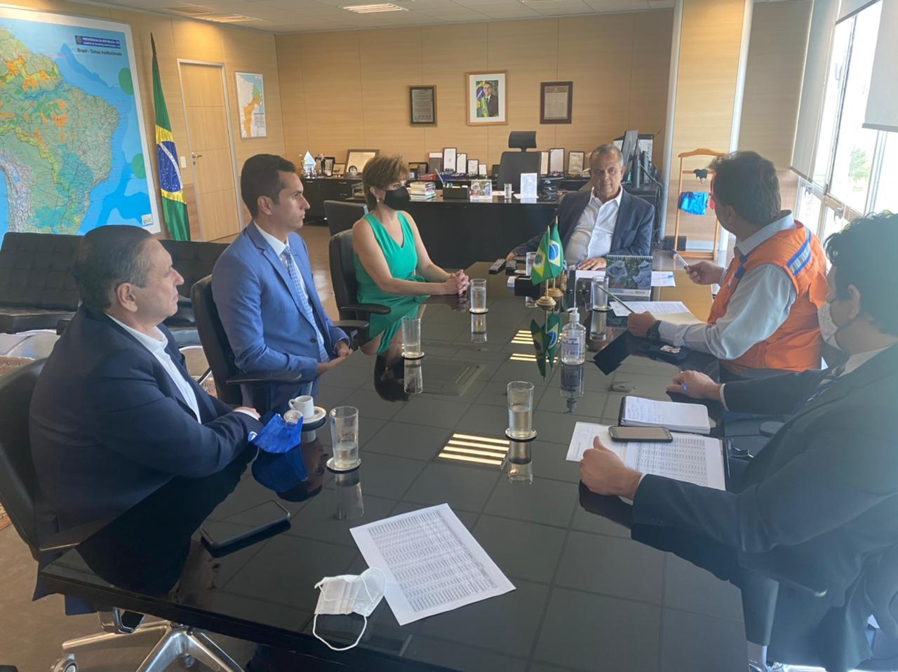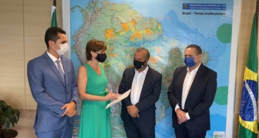 O ministro do Desenvolvimento Regional, Rogério Marinho, determinou a troca imediata do manancial utilizado por carros-pipas para abastecer comunidades de Tauá, durante audiência com a prefeita Patrícia Aguiar, Dep. federal Domingos Neto, Presidente Estadual do PSD, Domingos Filho e o secretário nacional da Defesa Civil, Alexandre Lucas, na tarde de hoje (02), em Brasília.