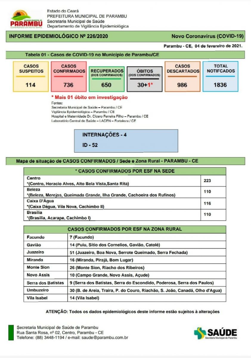 O município de Parambu atingiu 30 mortes por coronavírus no boletim epidemiológico divulgado na noite de hoje(04).