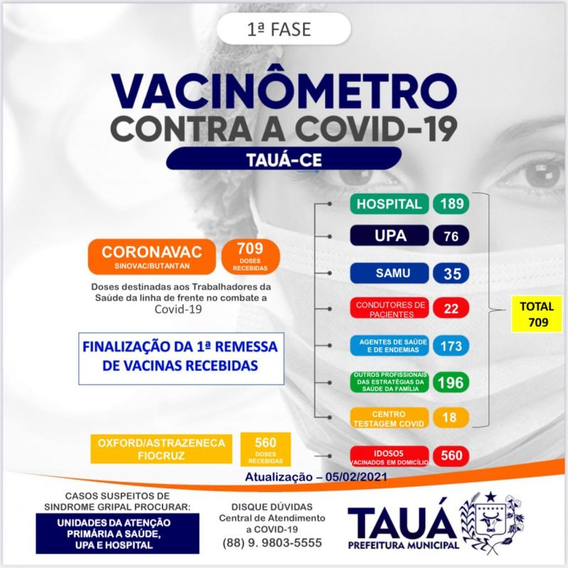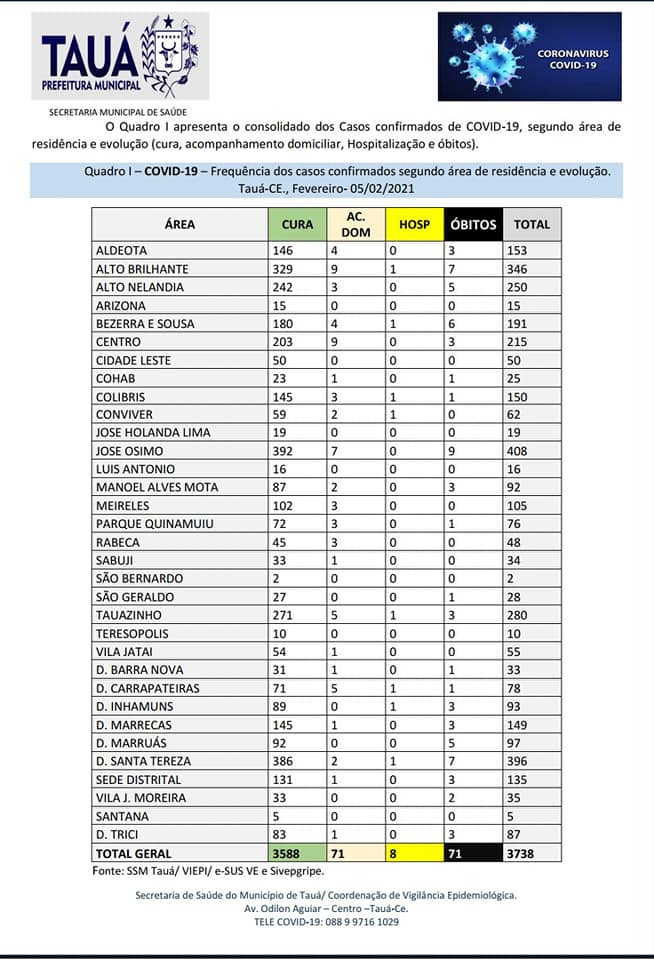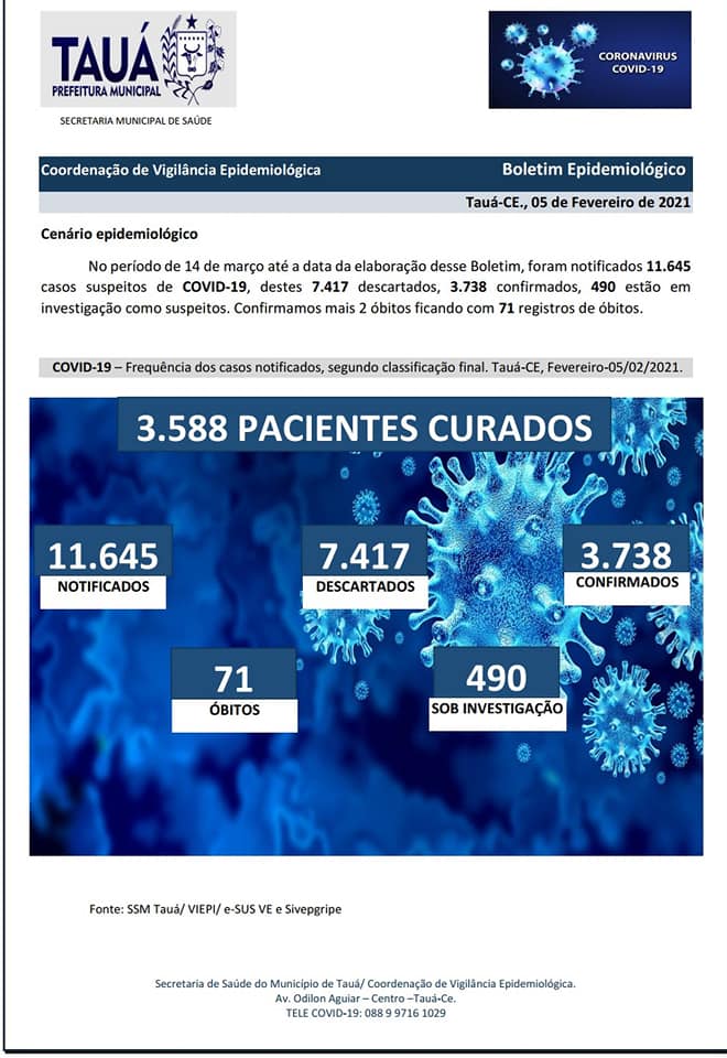 Com a confirmação de mais dois óbitos, o município de Tauá contabiliza 71 mortes por Covid, segundo o Boletim Epidemiológico divulgado pela Secretaria de Saúde na noite de ontem(05). Os pacientes residiam no Bairro Alto Brilhante e distrito de Carrapateiras, que registrou a primeira morte desde o início da pandemia.