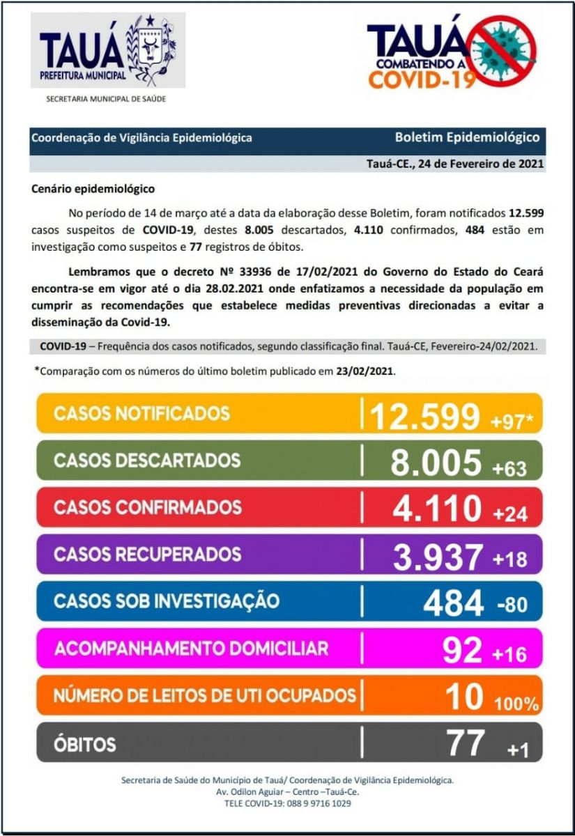 O Boletim Epidemiológico divulgado na noite de hoje(24), pela Secretaria de Saúde do Município de Tauá aponta aumento de do número de casos confirmados e de pacientes curados em comparação com a atualização de ontem(23).