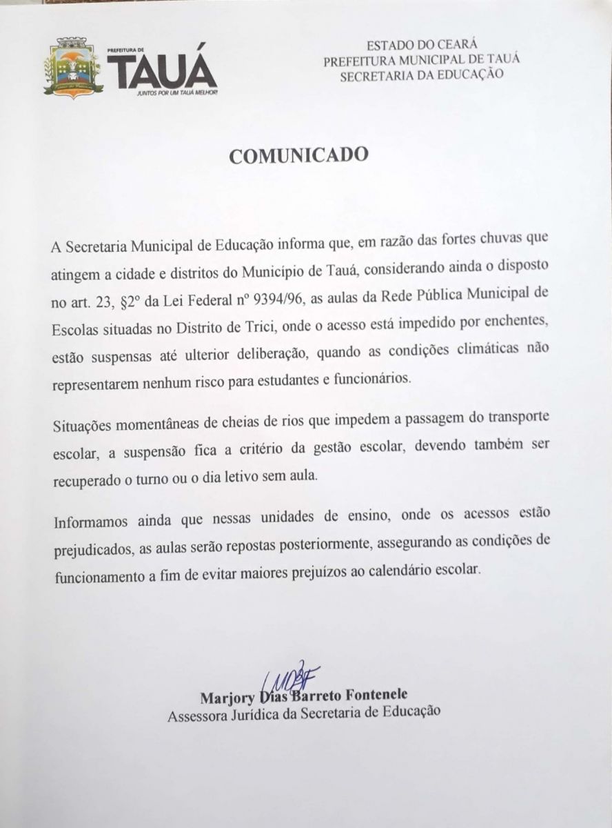 A Secretaria de Educação do Município de Tauá suspendeu as aulas por tempo indeterminado devido as fortes chuvas caídas no distrito de Trici. O anúncio foi feito nesta segunda-feira(16), por meio de comunicado divulgado à imprensa.