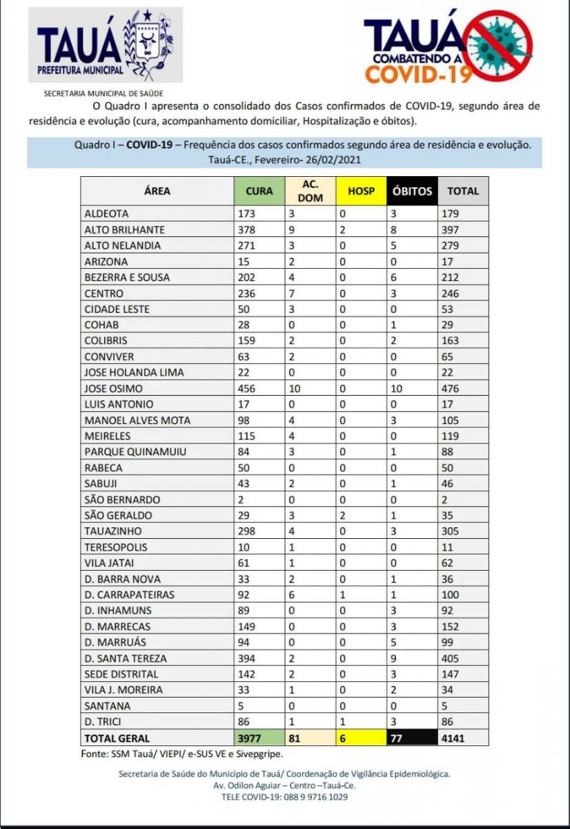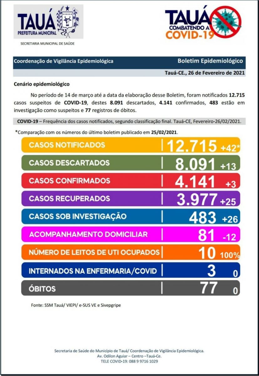 A Secretaria Municipal de Saúde divulgou na noite de hoje(26), mais um Boletim Epidemiológico atualizando os números da pandemia da Covid-19, em Tauá.