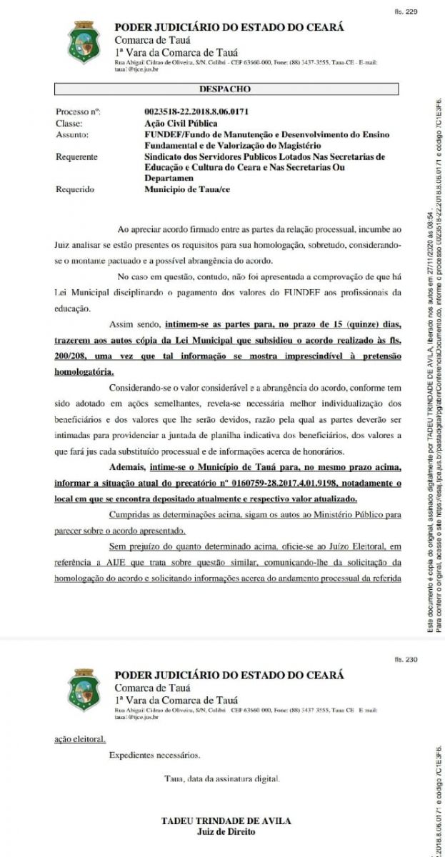 A Justiça de Tauá segue analisando o pedido de homologação do acordo para pagamento dos precatórios do Fundef que foi protocolado no ano passado.