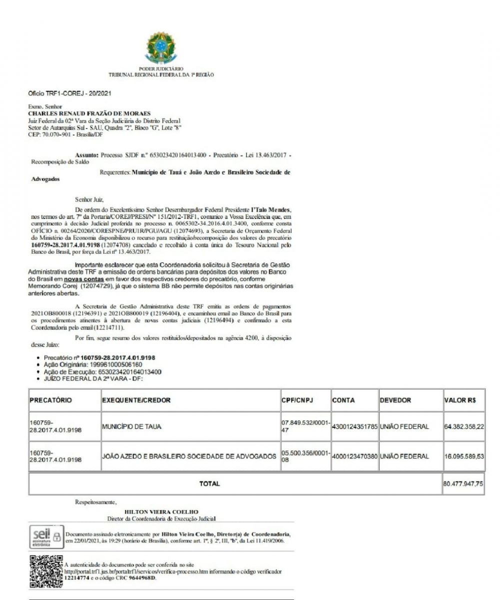 O ofício encaminhado pela União coloca a disposição do Juiz Federal Charles Renaud Frazão de Moraes, o valor atualizado de R$ 80.477.947,75.