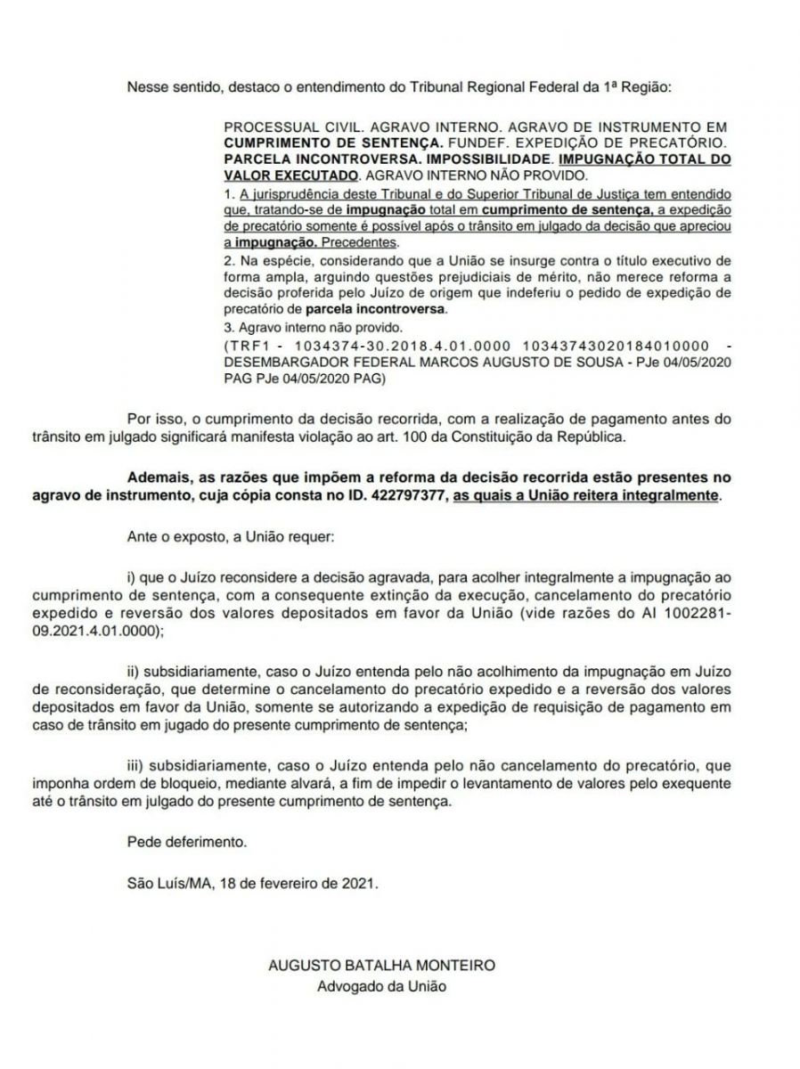 No último dia 18 de fevereiro, a AGU, Advocacia Geral da União, por meio do advogado Augusto Batalha Monteiro, ingressou com uma petição incorrente em que solicita a "extinção da execução, cancelamento do precatório expedido e reversão dos valores depositados em favor da União".