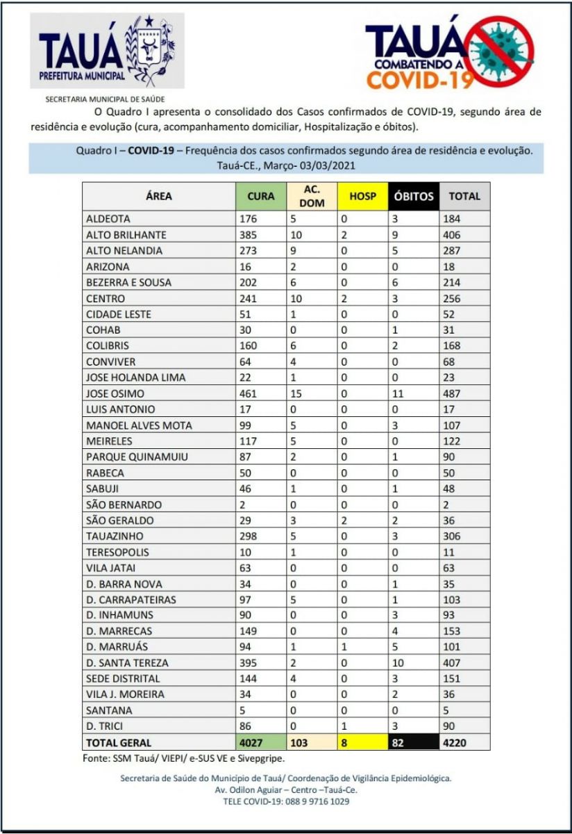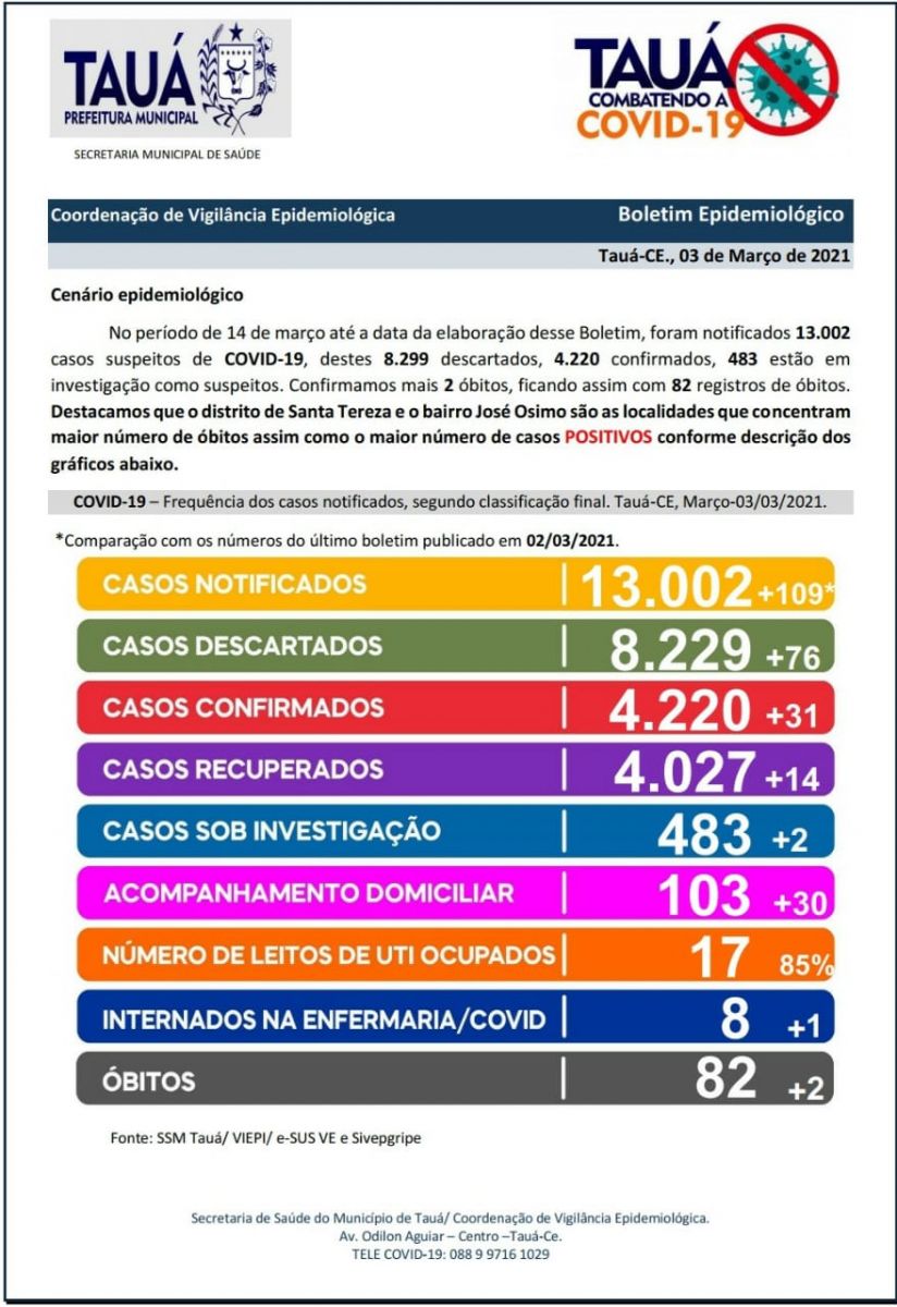 Mais dois óbitos por Covid foram confirmados pela Secretaria de Saúde do Município de Tauá por meio de Boletim Epidemiológico divulgado na noite de hoje(03), elevando para 82, o número de mortes pela doença.