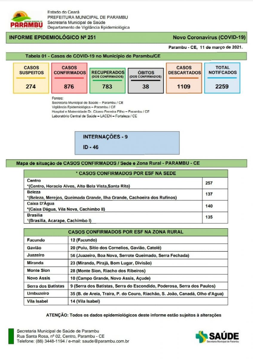 Boletim Epidemiológico de Parambu nesta quinta-feira(11/03)