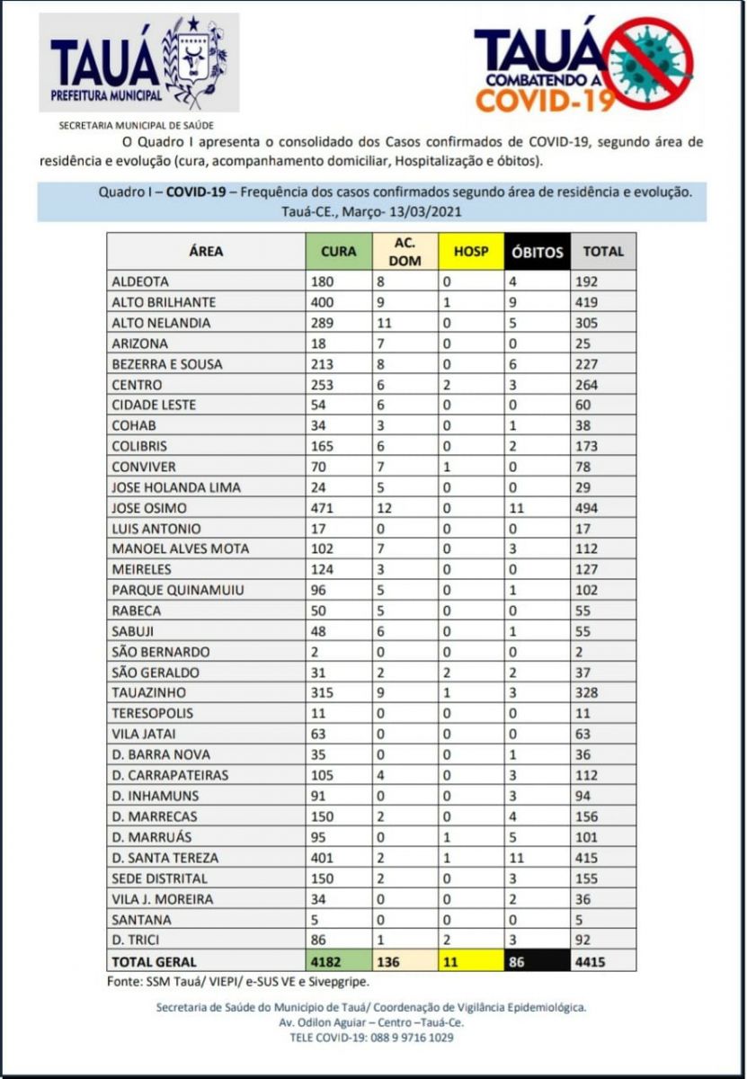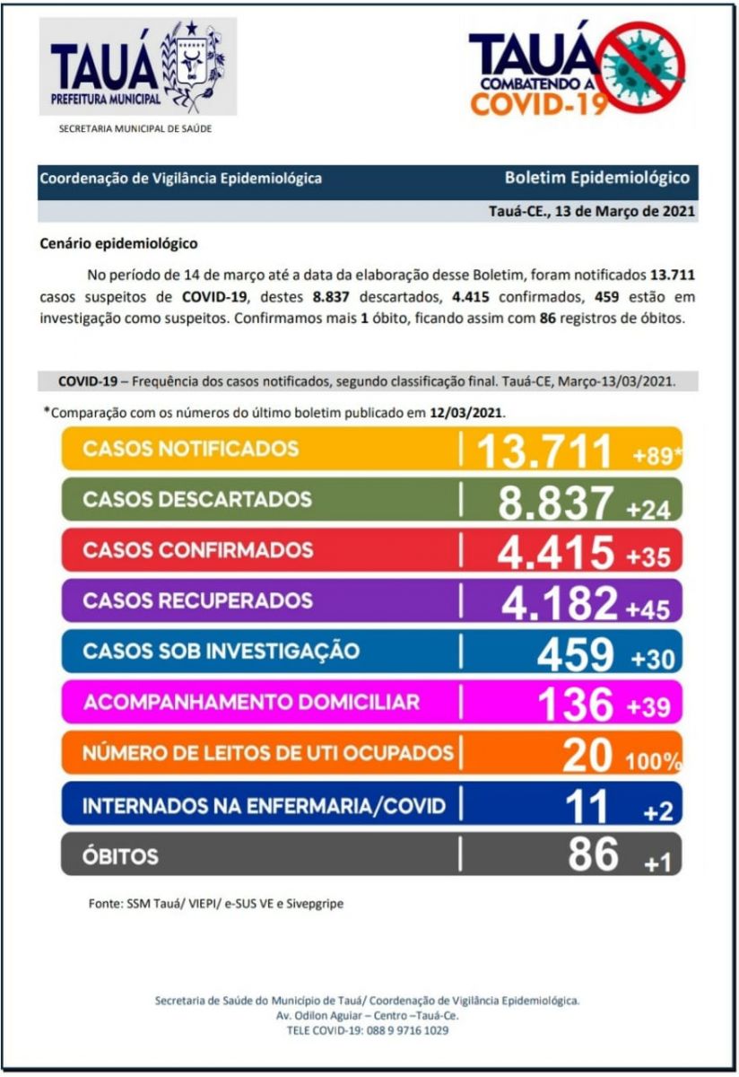 Mais um Boletim Epidemiológico atualizando os números da pandemia da Covid-19 foi divulgado na noite de hoje(13), pela Secretaria de Saúde de Tauá, com a confirmação do 86º óbito.