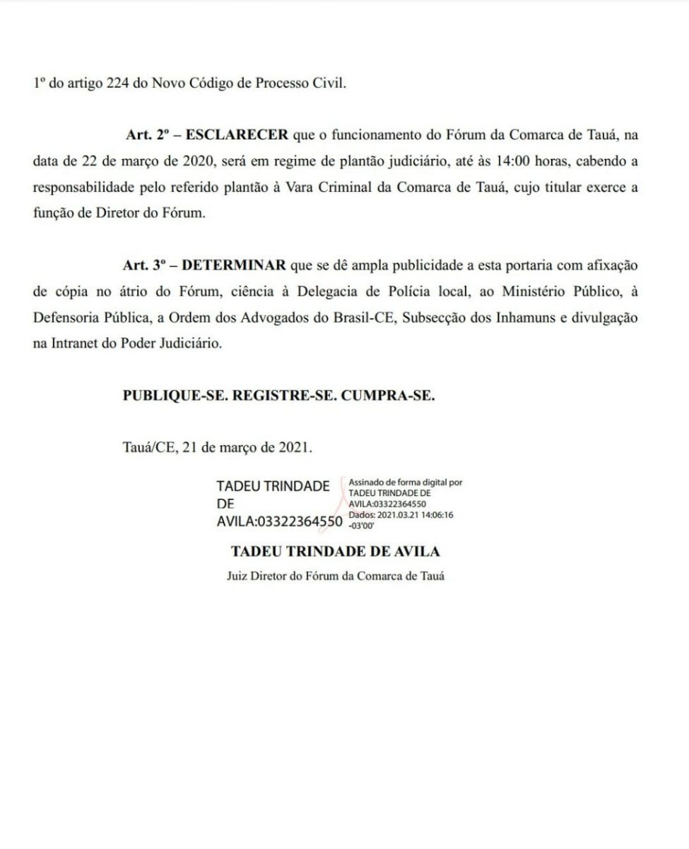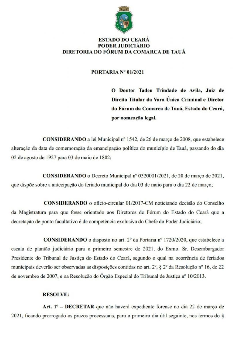O Juiz Diretor do Fórum da Comarca de Tauá, Dr. Tadeu Trindade de Ávila baixou Portaria na tarde de hoje(21), estabelecendo o Plantão Judiciário no Fórum Dr. Fábio Augusto Moreira de Aguiar nesta segunda-feira(22), devido a antecipação do Feriado Municipal do dia 3 de maio.