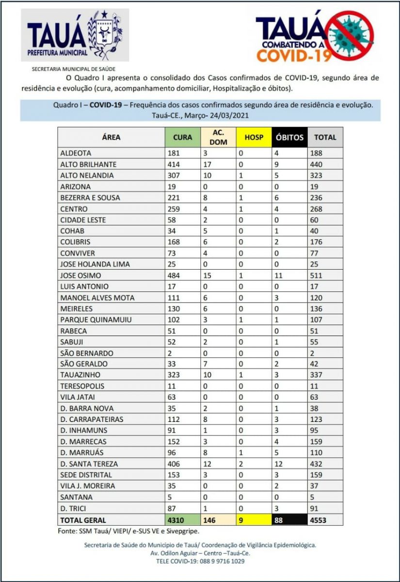O Distrito de Santa Teresa assumiu o primeiro lugar isolado em número de mortes por coronavírus no município de Tauá, desde o início da pandemia em março de 2020, com o registro de 12 óbitos, segundo o Boletim Epidemiológico divulgado na noite de hoje(24), pela Secretaria de Saúde, que contabilizou mais uma morte ontem(23). Em segundo lugar aparece o Bairro Dr. José Ósimo, com 11 registros fatais.