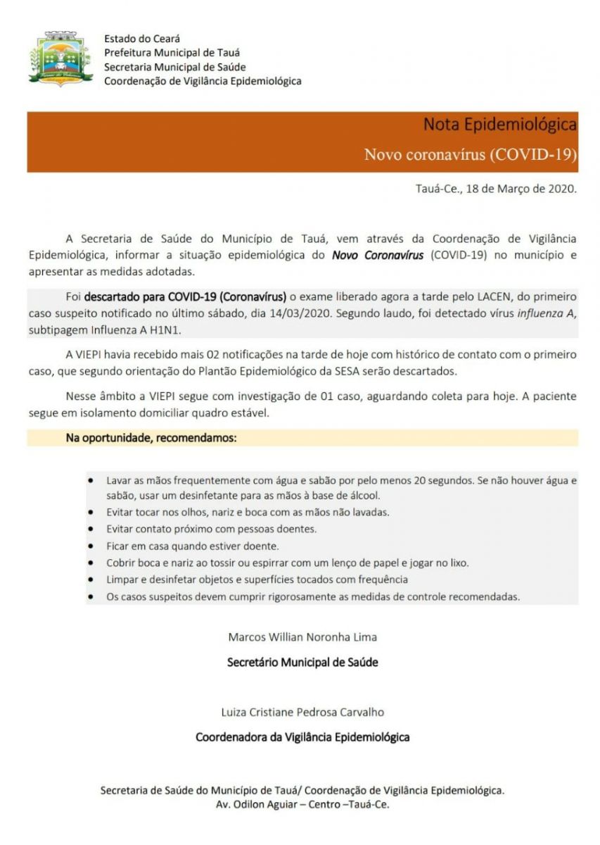 A Secretaria de Saúde do município de Tauá anunciou na tarde desta quarta-feira(18), que o primeiro caso de suspeita de coronavírus notificado no último final de semana, foi descartado, após a divulgação resultado do exame feito pelo LACEN.