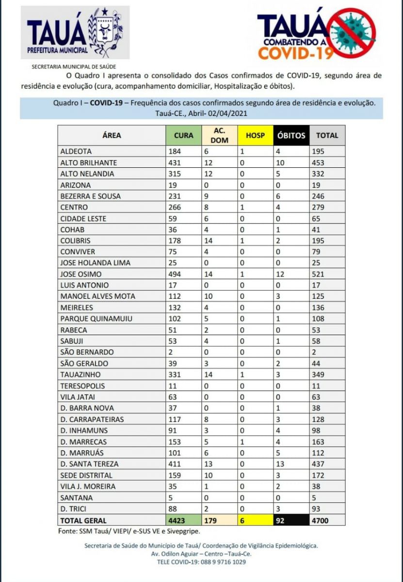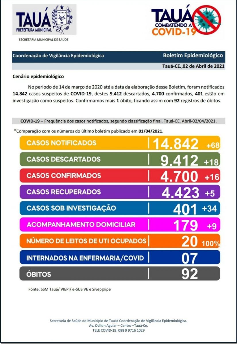 Boletim Epidemiológico divulgado na noite de ontem(02), pela Secretaria de Saúde contabiliza o 92º óbito por coronavírus no município de Tauá.