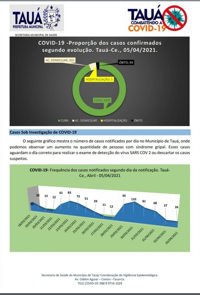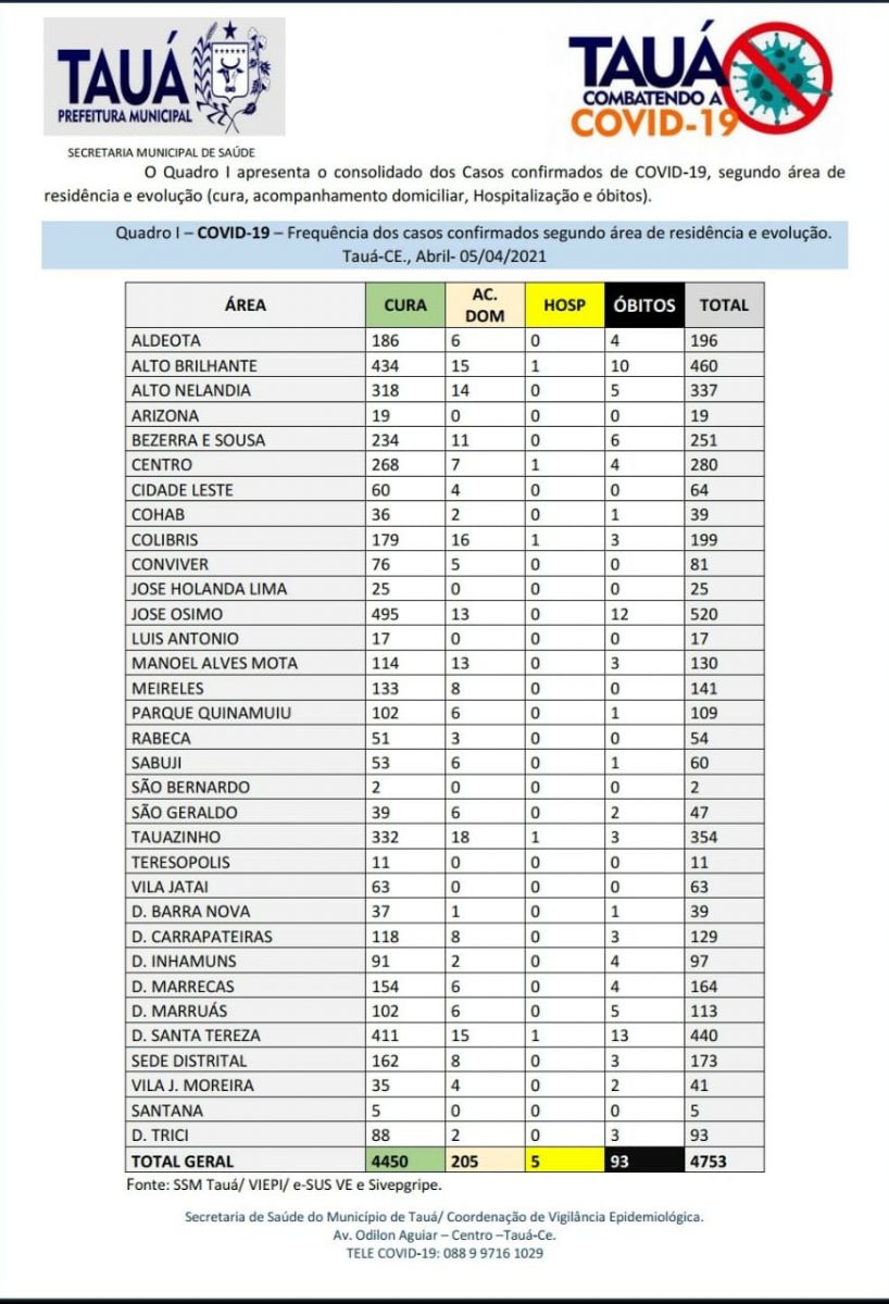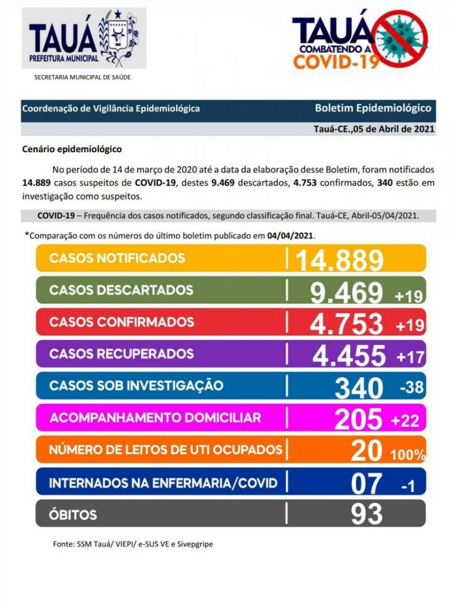 O município de Tauá completa 93 mortes por coronavírus, segundo o boletim epidemiológico divulgado na noite de ontem(05), pela Secretaria de Saúde.