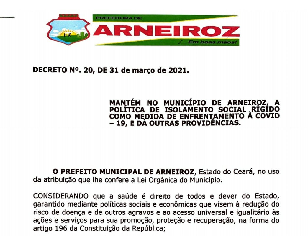O Artigo 1º da publicação diz que "este Decreto dispõe sobre medidas gerais de contenção à disseminação da COVID-19 e mantém no município de Arneiroz até 11 de abril de 2021, a política de isolamento social rígido para o enfrentamento da pandemia, consistente na restrição ao desempenho de atividades econômicas e comportamentais, bem como no controle da circulação de pessoas e veículos nos espaços e vias públicas, objetivando reduzir velocidade de propagação da doença".