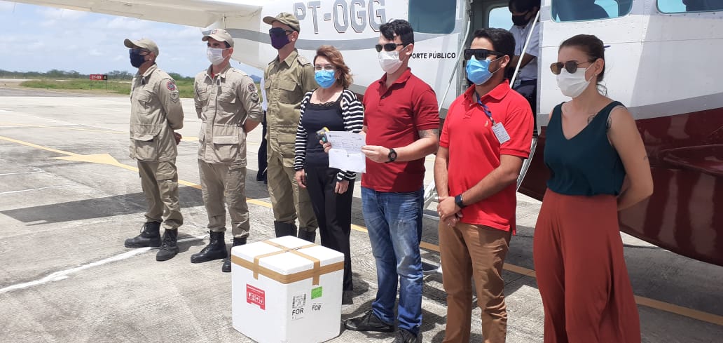 Ao todo, 2.955 doses, sendo 1.765 da AztraZeneca/Oxford e 1.190 de CoronaVac edesembarcaram no Aeroporto Regional Pedro Teixeira Castelo, em Tauá, e foram recebidas pela Coordenadora Regional de Saúde, Dra. Dulce Feitosa e sua equipe.